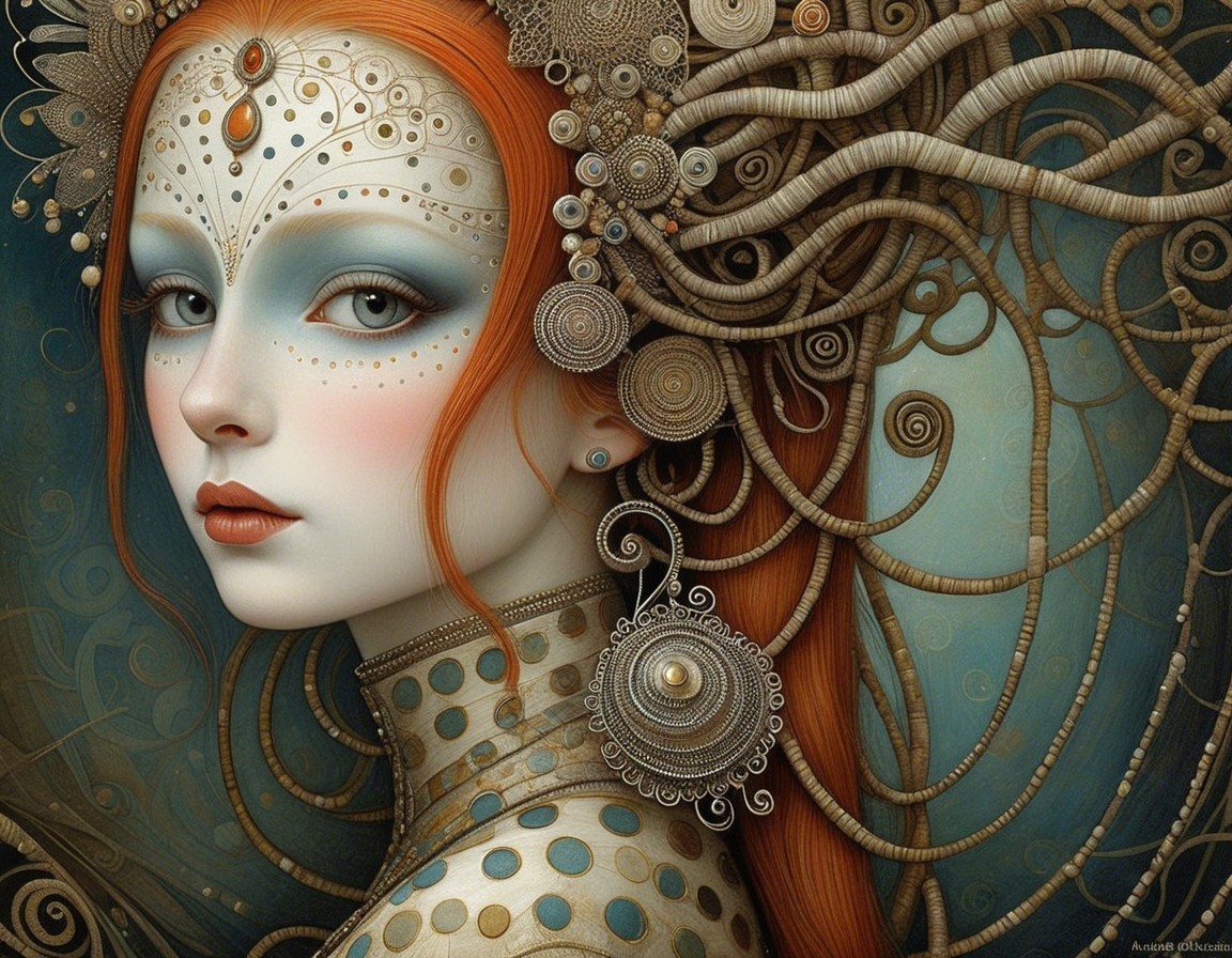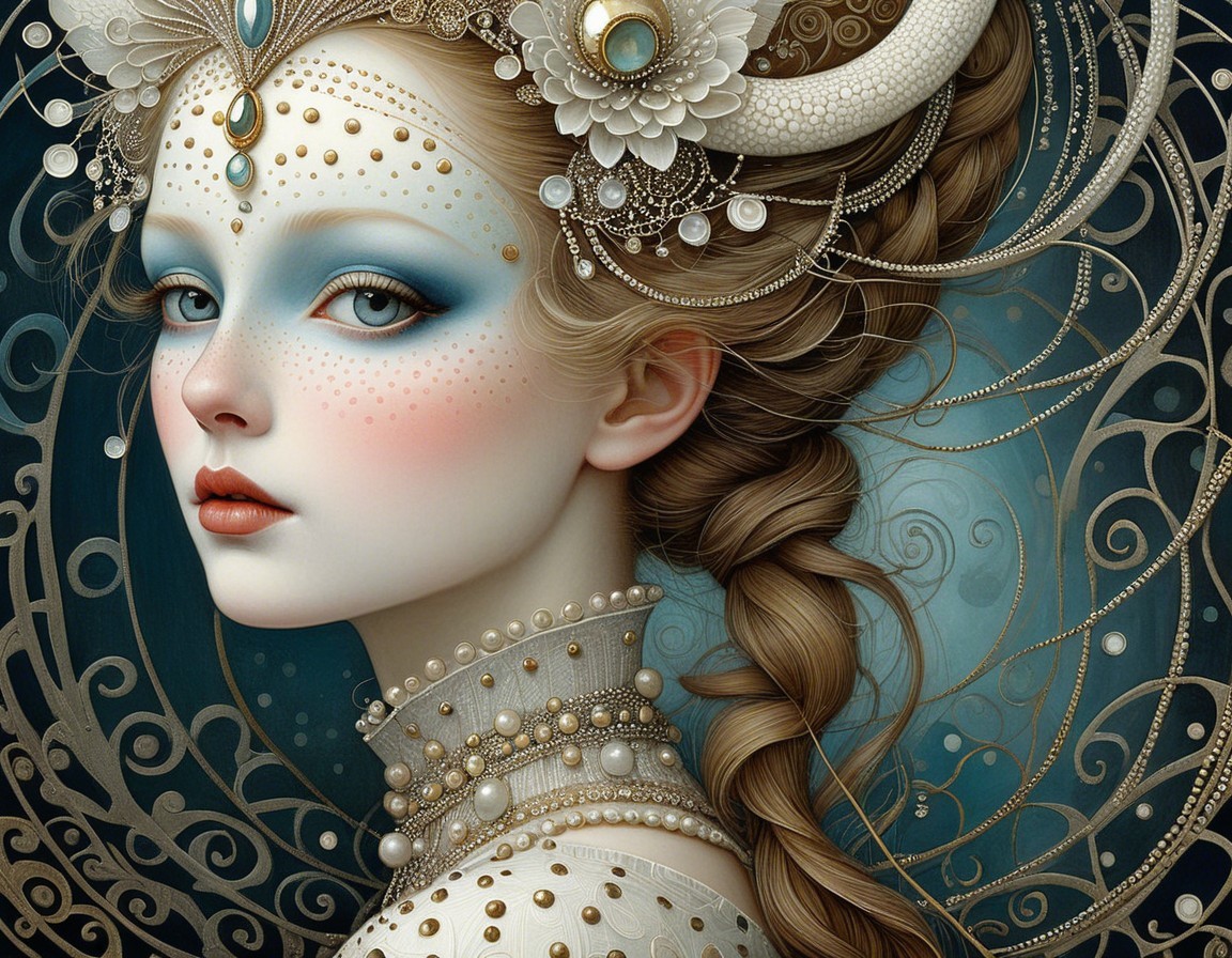 The artwork features a striking woman with pale skin and elaborate makeup. She wears a pearl necklace and has intricate, swirling patterns in the background, enhancing her elegant appearance.