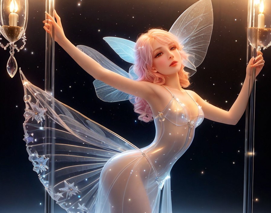 A digital artwork of a fairy with translucent wings and a shimmering outfit, holding onto a lamp post with glowing lights and stars.