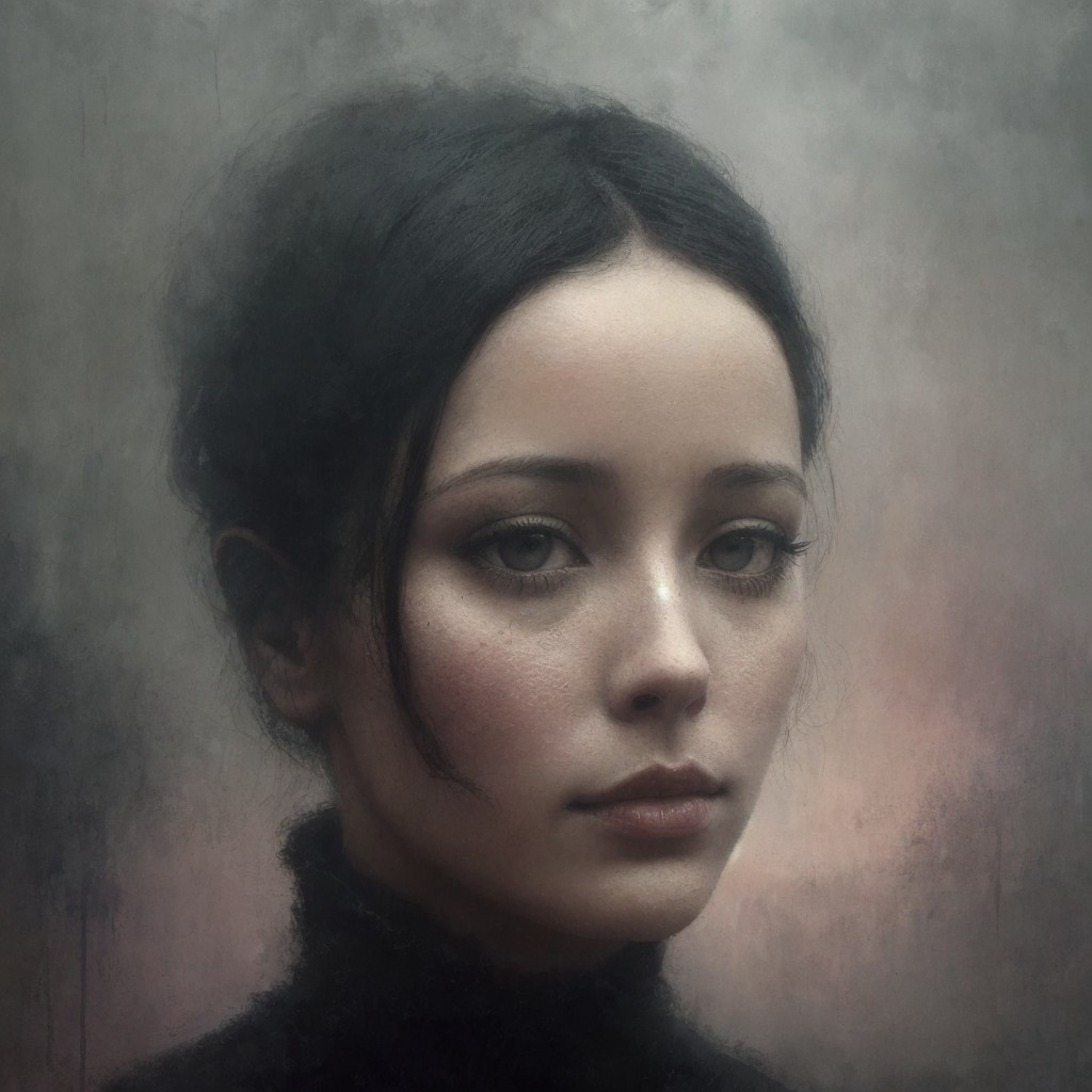 A striking portrait of a young woman with captivating green eyes and a soft expression, set against a moody, blurred cityscape backdrop that adds an air of mystery.