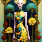 A surreal figure stands against a backdrop of stylized trees and vibrant flowers. She wears a striking yellow and teal dress, adorned with whimsical patterns and an eye motif, embodying a dreamlike essence.