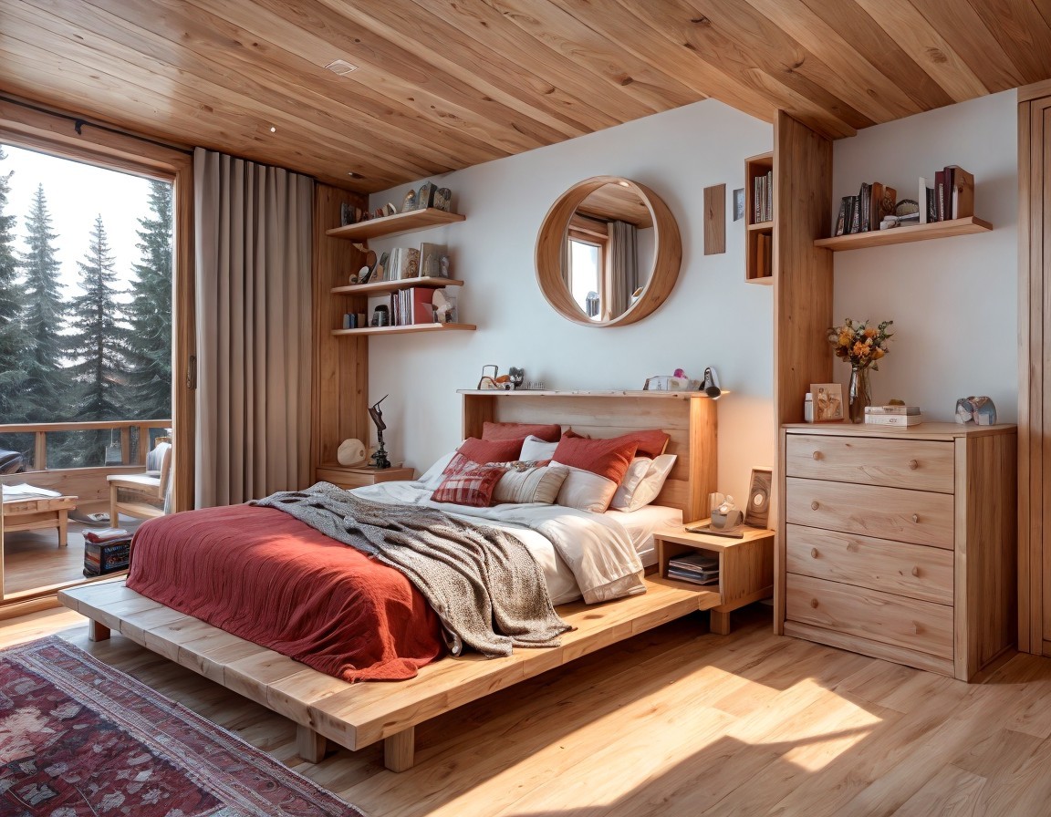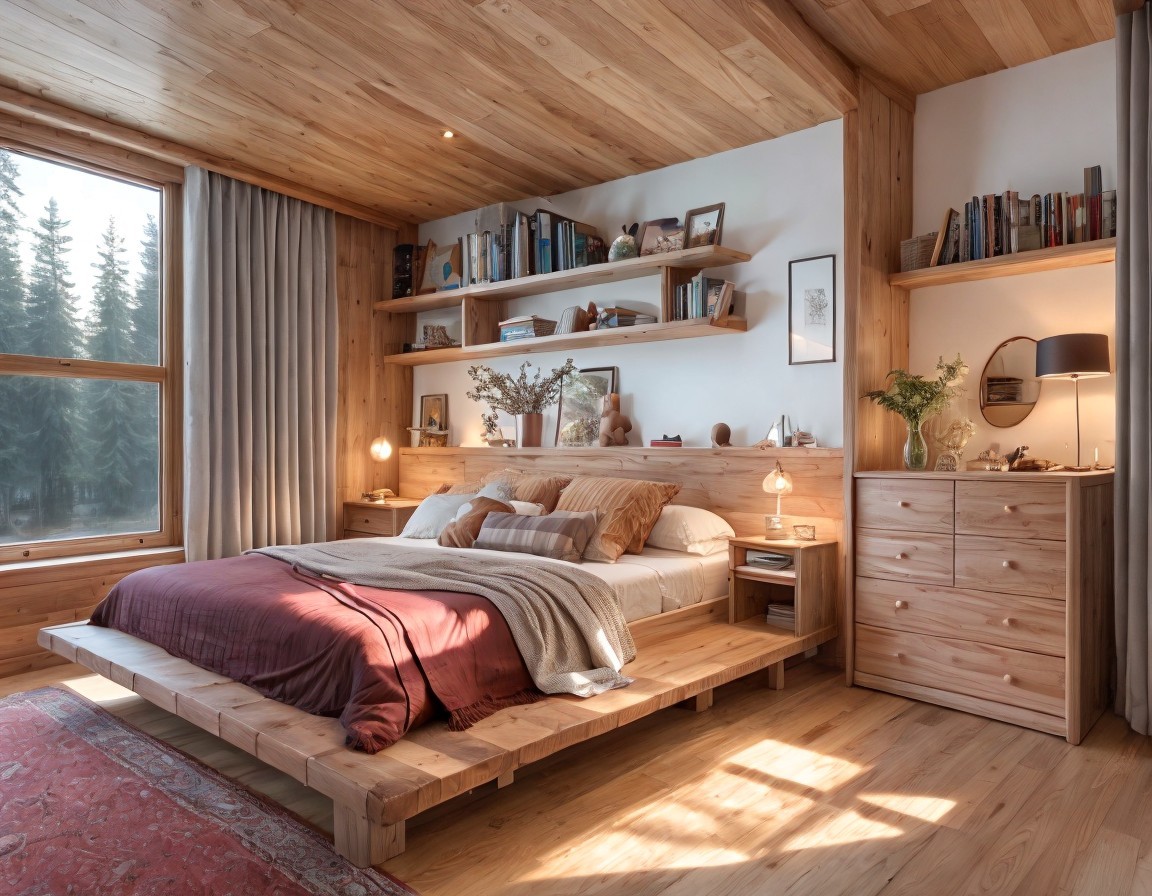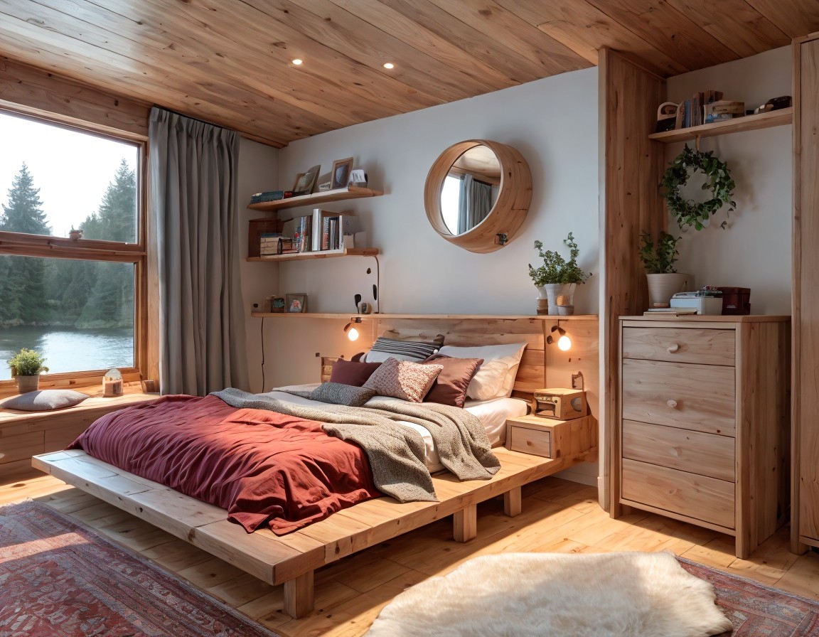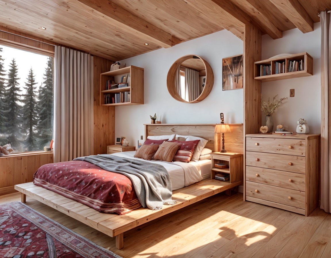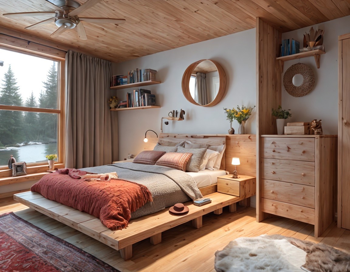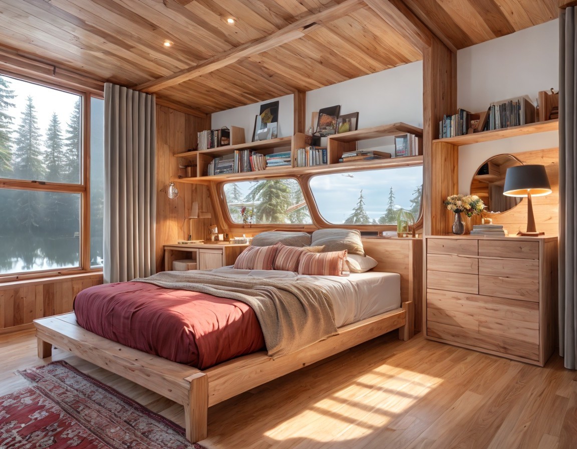 A cozy wooden bedroom features a large bed with soft linens, bookshelves, and big windows showcasing a serene lake view surrounded by trees, creating a warm, inviting atmosphere.