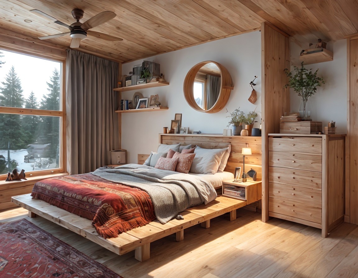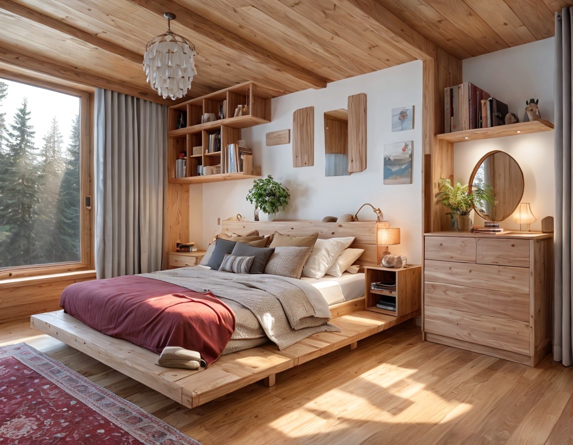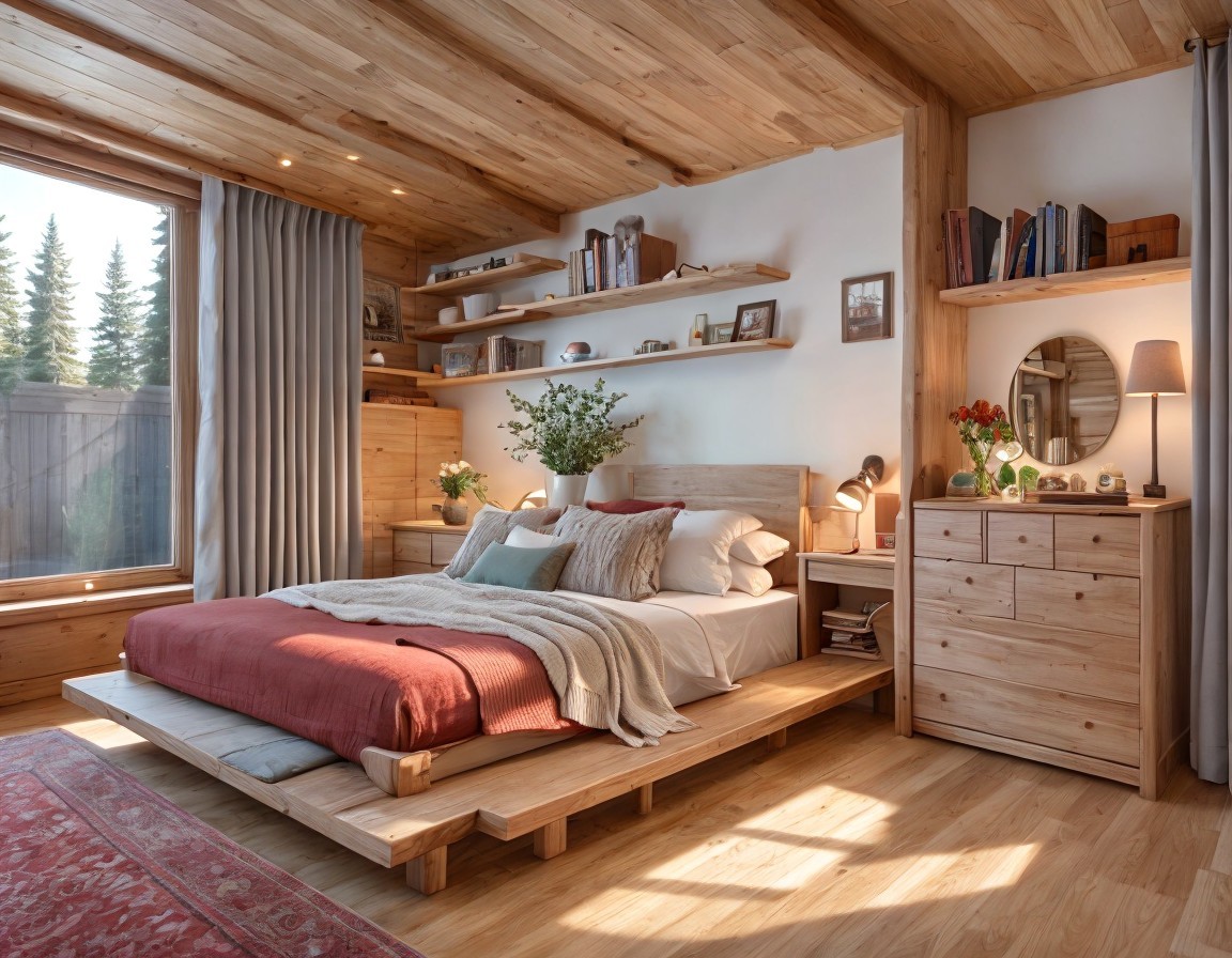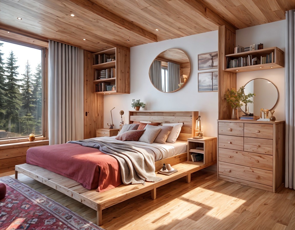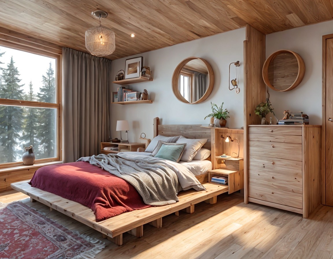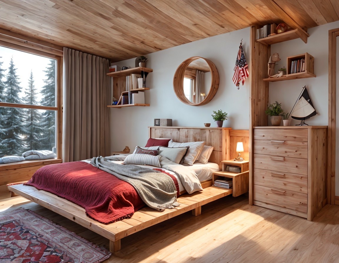 A cozy wooden bedroom features a large bed with soft linens, bookshelves, and big windows showcasing a serene lake view surrounded by trees, creating a warm, inviting atmosphere.