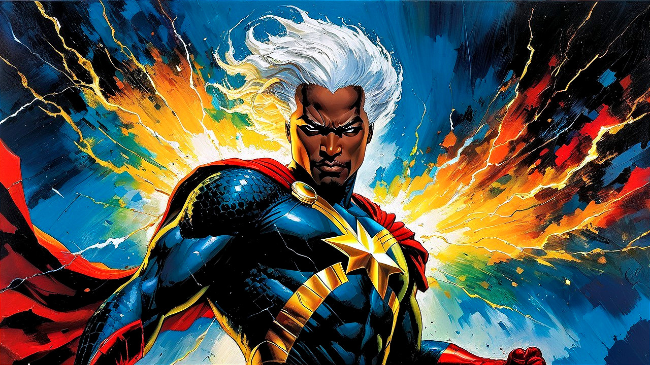 A vibrant oil painting of a powerful superhero, showcasing intricate textures and layers through glazing techniques. The artwork features a surreal style with rich colors and exceptional detail.