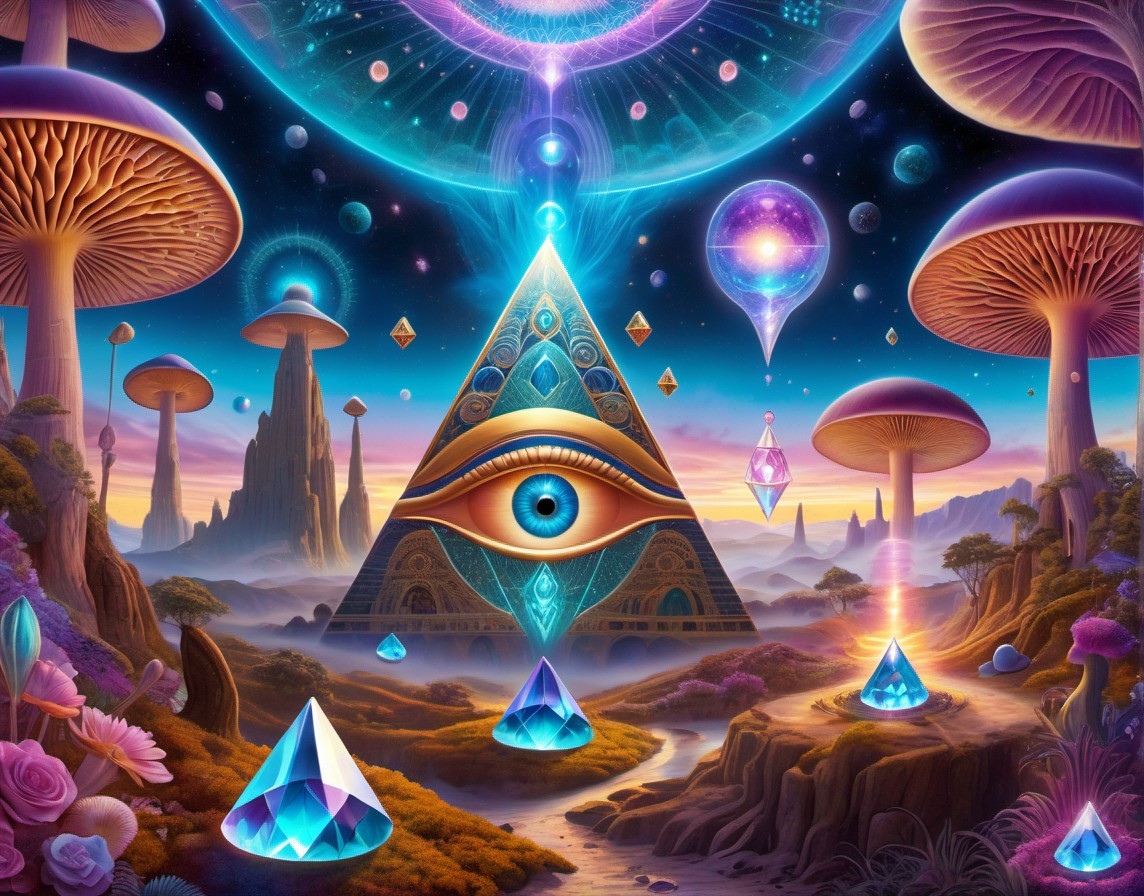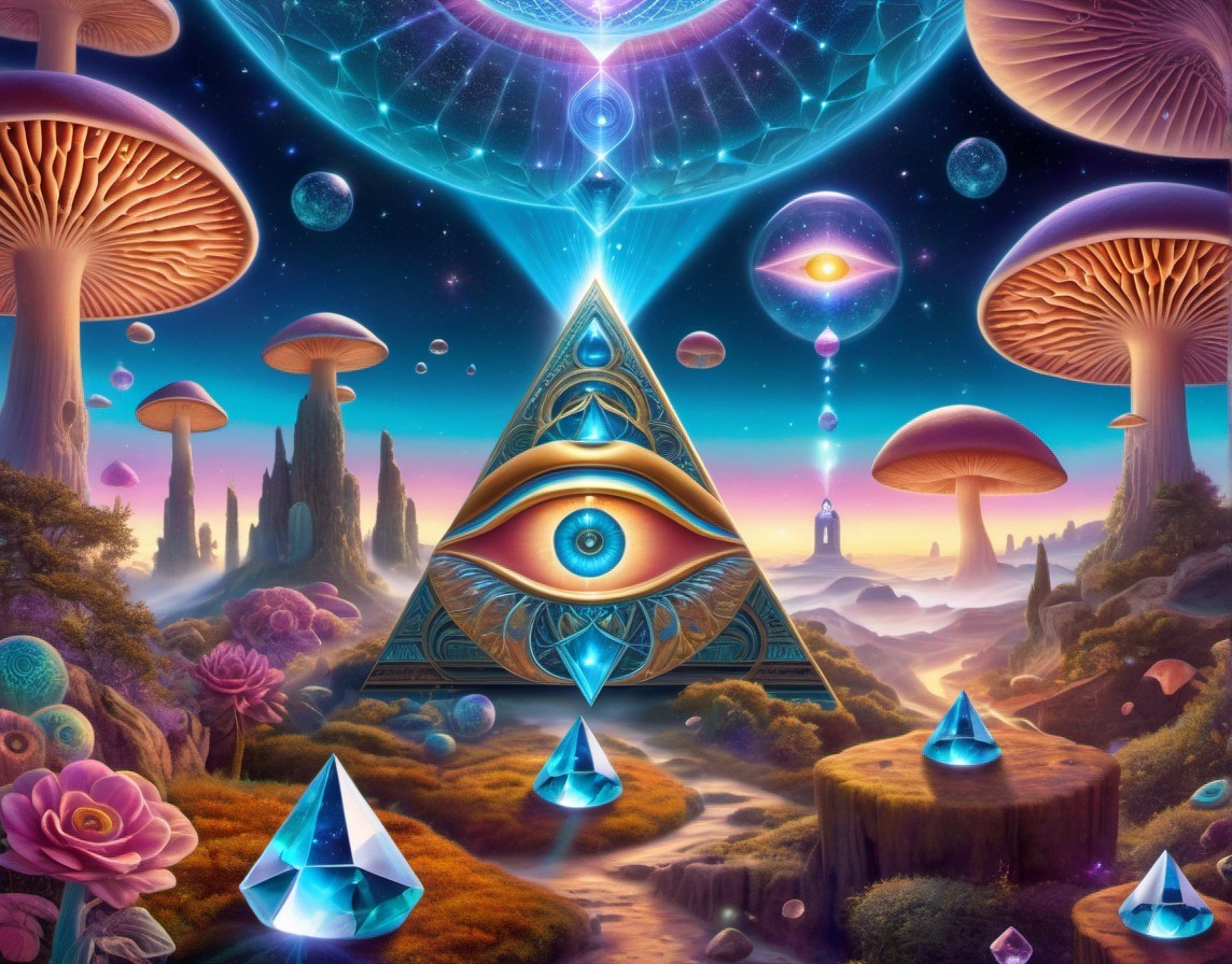 + Prompt:surreal deep dream concept, realistic psilocybin mushrooms intertwined with giant crystals, futuristic aliens engaging in time travel, alchemy, and magic. Embrace chaos magic, sacred geometry, mystical occultism with symbols like the hamsa, eye of providence, talisman, and esoteric elements. Incorporate tarot, psychic pagan occult references. Envision a scene with a pyramid under a celestial sun and moon, hinting at astral projection and mystical encounters. Explore the theme of cosmic entities, trippy mushrooms, and psychedelic experiences with galactic dmt beings, shamanic LSD art, magic mushrooms, and the enigmatic DMT realm. Capture the essence of mysticism through intricate details and vibrant colors, blending elements of fantasy and reality seamlessly.