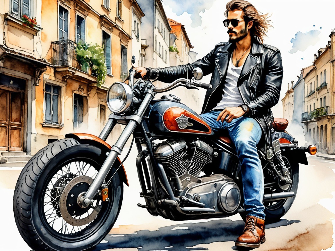 A stylish man rides a vintage motorcycle through a scenic street. He wears a leather jacket and sunglasses, exuding a confident, rebellious vibe against a vibrant, artistic backdrop.