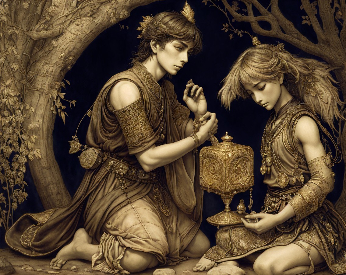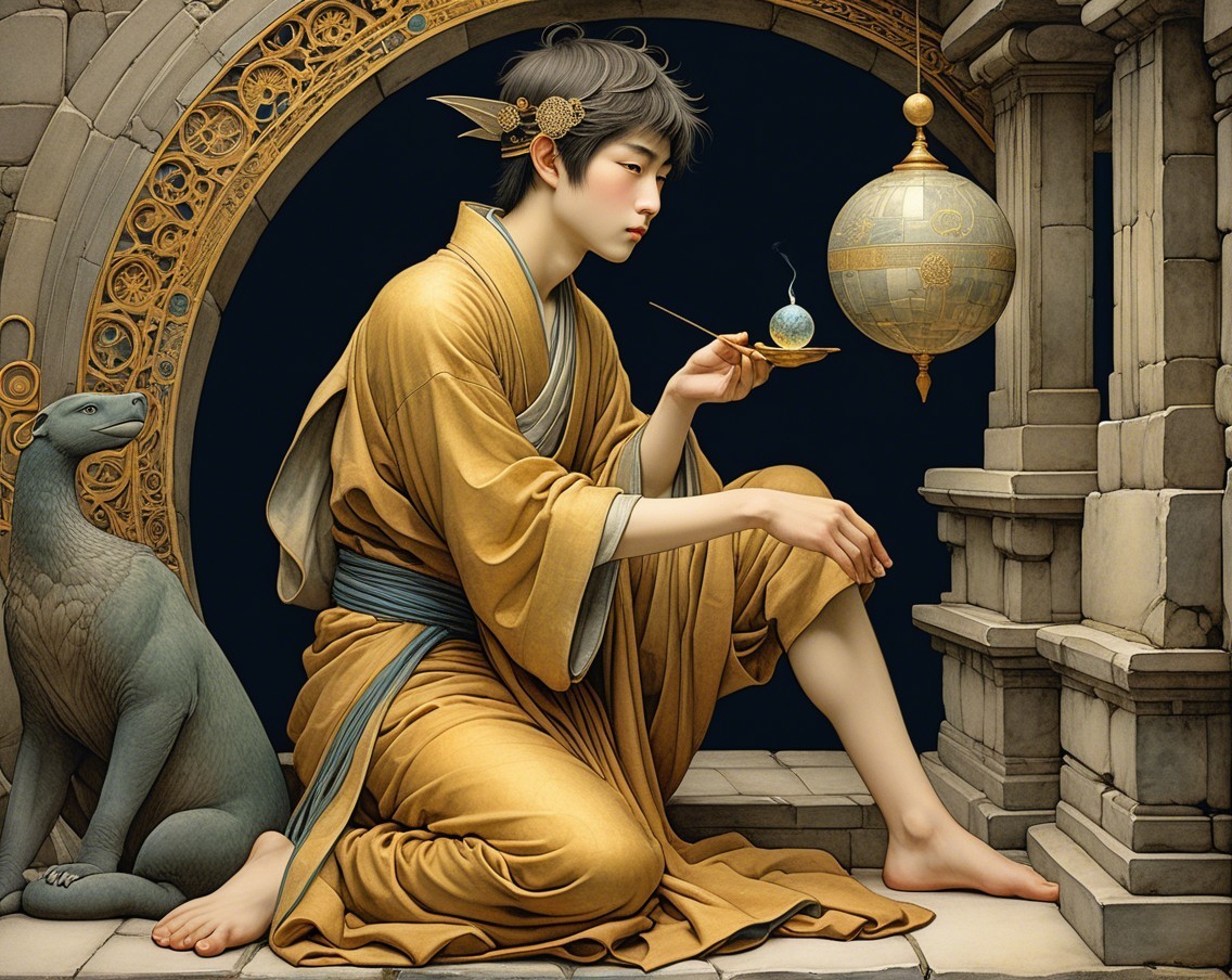 Ancient cities, ancient tales. Ancient spirits Beautiful exotic boy. in the style of Ohara Koson. Golden Ratio, Surreal Fantasy, Elegant, High Definition Ultra Fine 3D Line, Zenangle Style, Watercolor Patchwork , Arthur Rackham Style, Paul Kidby, Gediminas Prankevicius, Jacek Jerka, Extremely Detailed, Intricate, Thoughtful, HDR, Fractal, Beautiful, Award Winning, Fantasy Look, Fantasy, Crisp Quality
