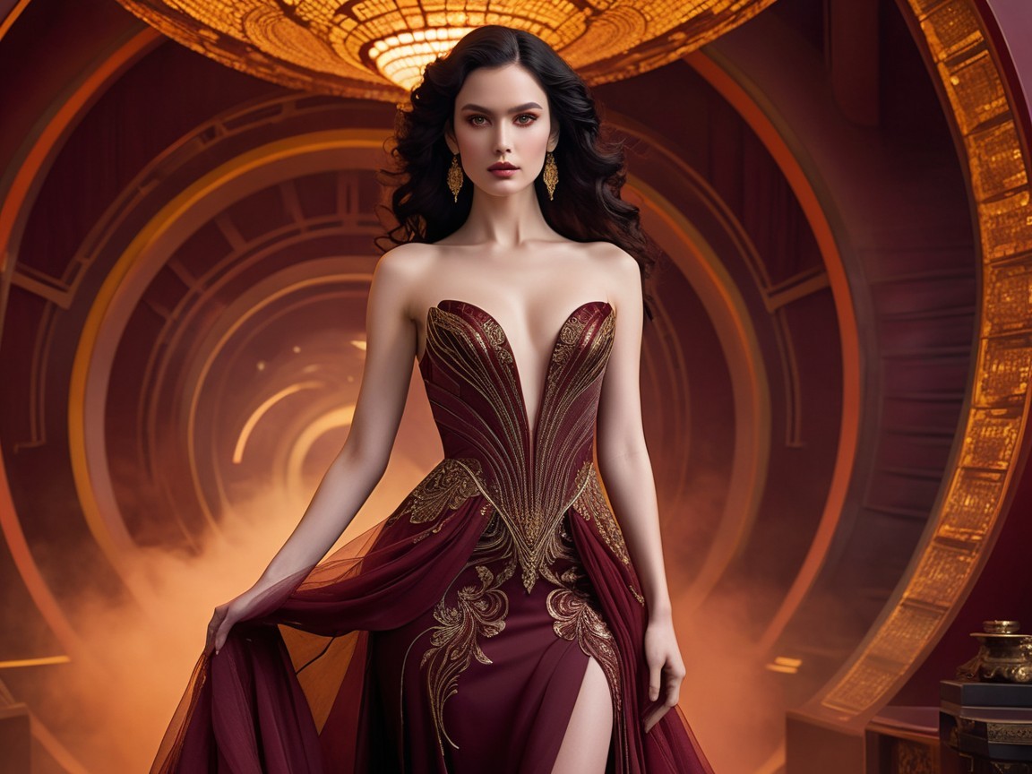 Prompt: "An elegant, porcelain-skinned woman with flowing raven hair and glowing amber eyes stands poised, wearing a richly detailed, high-low maroon and gold gown adorned with intricate, swirling patterns and subtle, shimmering accents. The gown's delicate, layered tulle flows behind her like a crimson mist. Set against the backdrop of a hyperdetailed, Blade Runner-esque futuristic cityscape, with towering skyscrapers illuminated in vibrant, electric teal and cobalt blue hues that reflect off the metallic surfaces, casting a kaleidoscope of colors across the scene. Above her, glowing, iridescent celestial fragments drift, casting an ethereal, surreal light on crystalline blue mountains, their facades reflecting hues of amethyst and sapphire, and a large, radiant, silver-crescent moon rising on the horizon, casting a gentle, lunar glow. The scene combines elements of beauty, mystery, and cosmic wonder, blending the surrealism of Zdzisław Beksiński, the futuristic elegance of Syd Mead, and the dreamlike quality of Simon Stalenhag's concept art, with delicate brushstrokes reminiscent of Disney's classic animation, and vibrant colors of a H.R. Giger-inspired atmosphere. (best quality), (masterpiece), (super realistic, top quality, masterpiece),A young woman creating a captivating scene that combines determination with femininity against the backdrop of a serene setting. rear view, full body. Beautiful face, (Nice muscles: 1.6), (Thick thighs: 1.6), (White hair), (Back: 2.0), (Close-up lower body: 2.0), (Side view), ,(Low angle: 2.0), (Detailed hands: 2.0), (Beautiful woman hands: 2.0), (Healthy: 2.0), (Healthy hair: 2.0),"