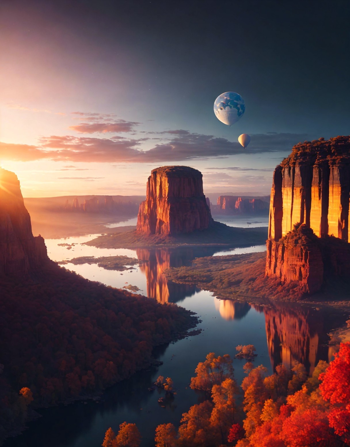 A breathtaking landscape featuring towering rock formations reflected in a serene river at sunset. Colorful hot air balloons float above, enhancing the vibrant hues of the sky and foliage.