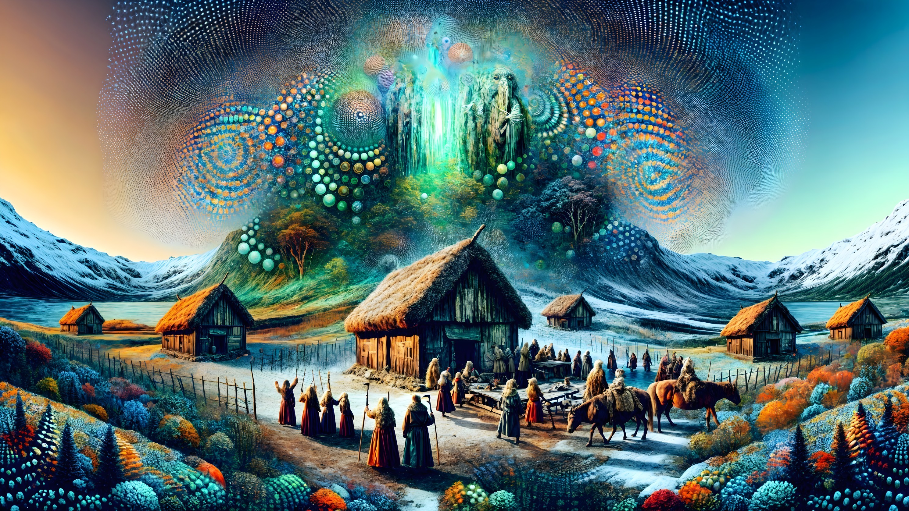 A serene countryside scene features a couple walking hand-in-hand, surrounded by lush greenery, roaming cattle, and quaint houses under a bright sky, evoking a sense of harmony and nature.
