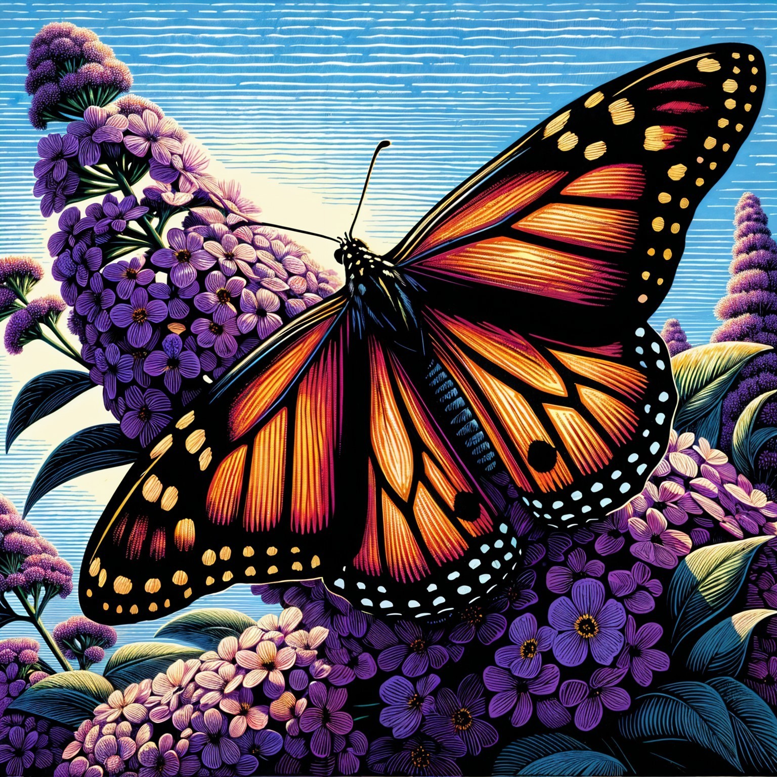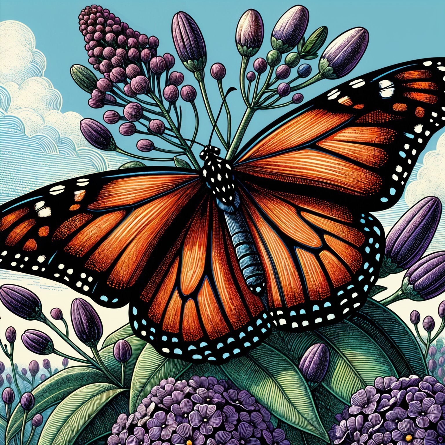 A vibrant Monarch butterfly spreads its wings amidst lush green leaves and colorful flowering plants under a bright, blue sky, showcasing nature's beauty and intricate detail.