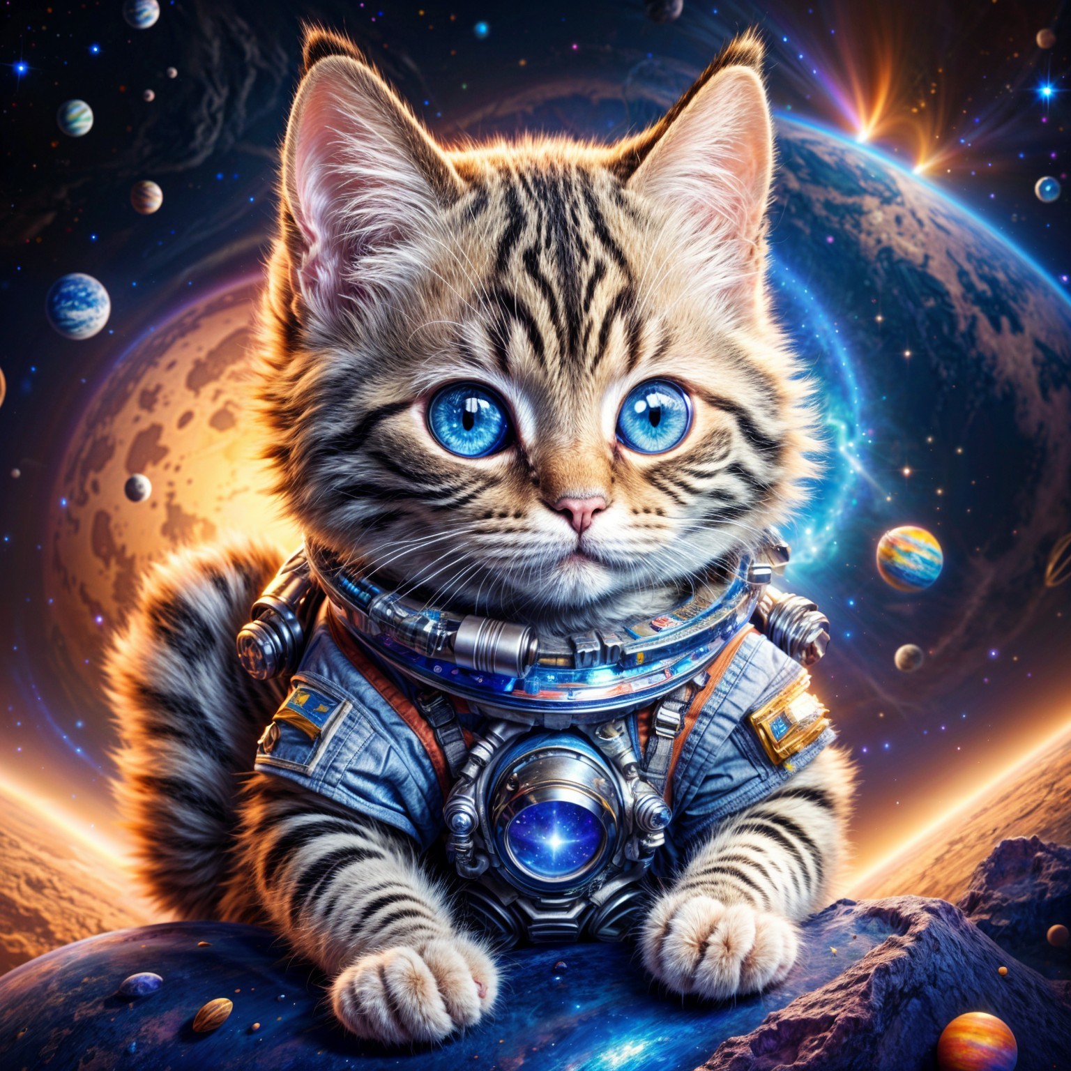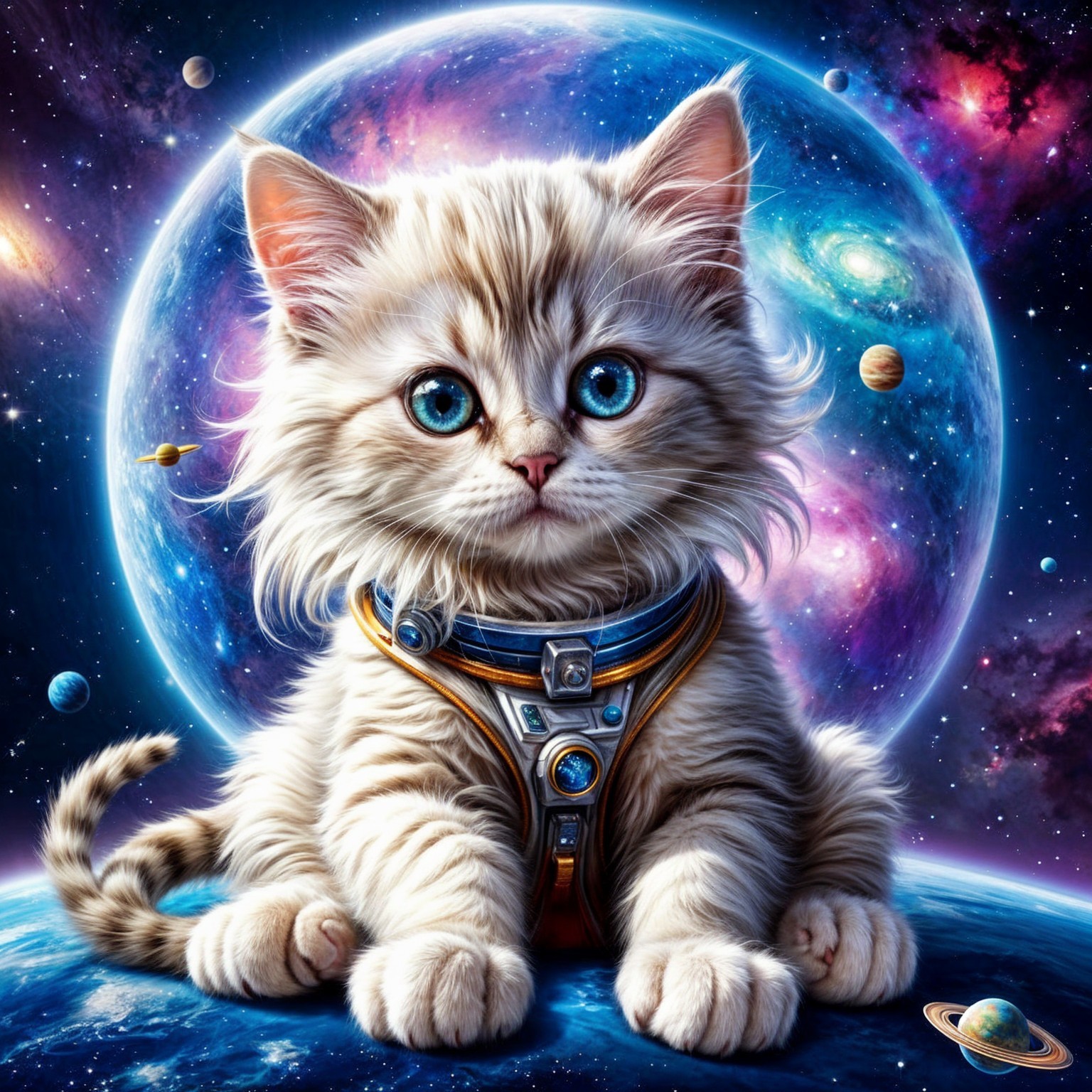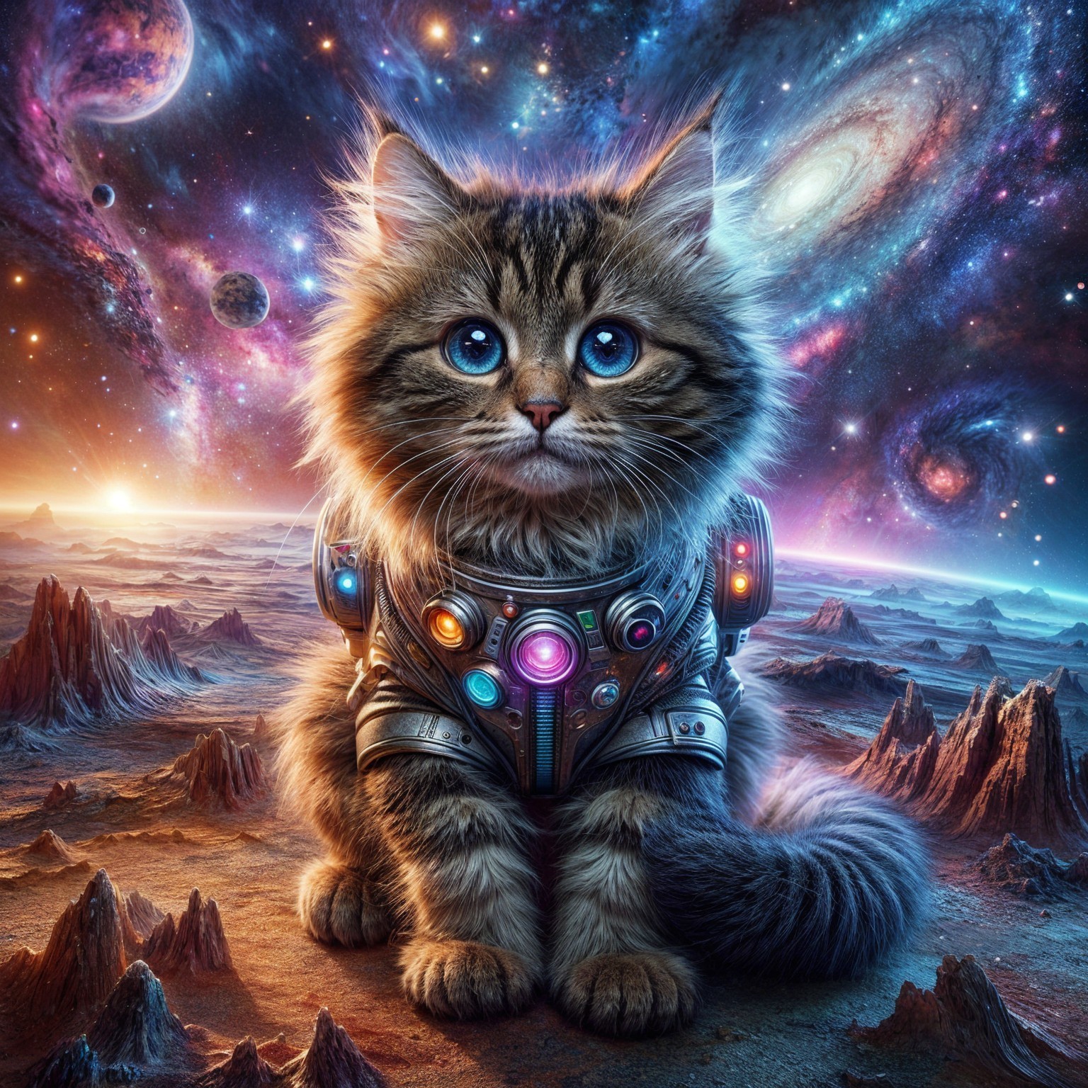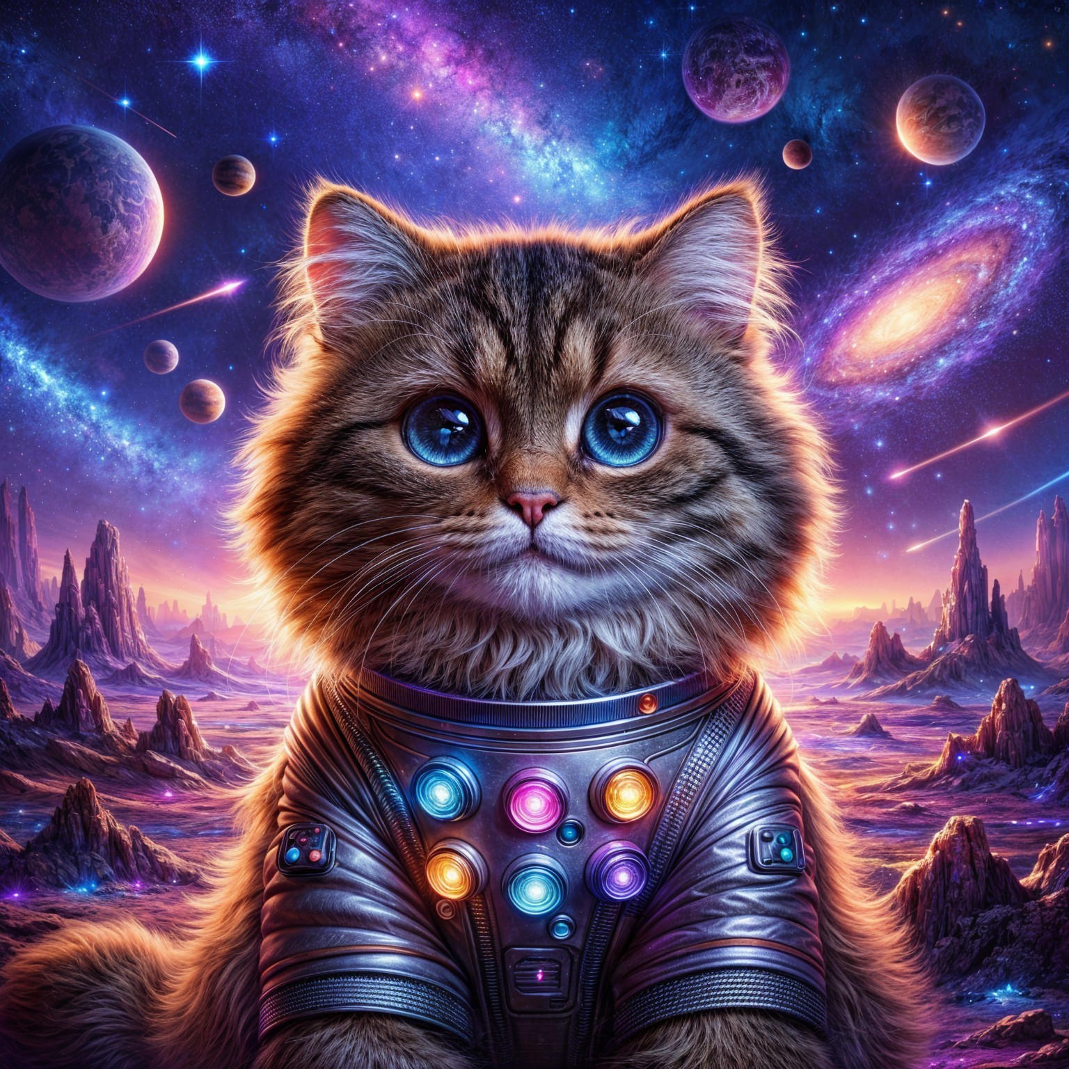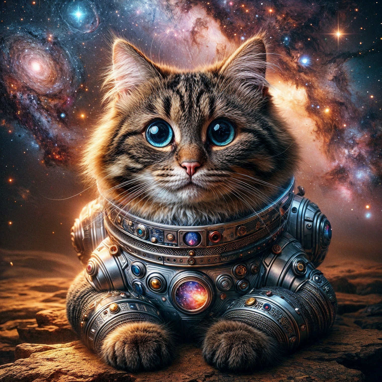 A fluffy cat with striking blue eyes wears a futuristic metallic suit, sitting on a rocky surface against a cosmic backdrop of swirling galaxies and twinkling stars.