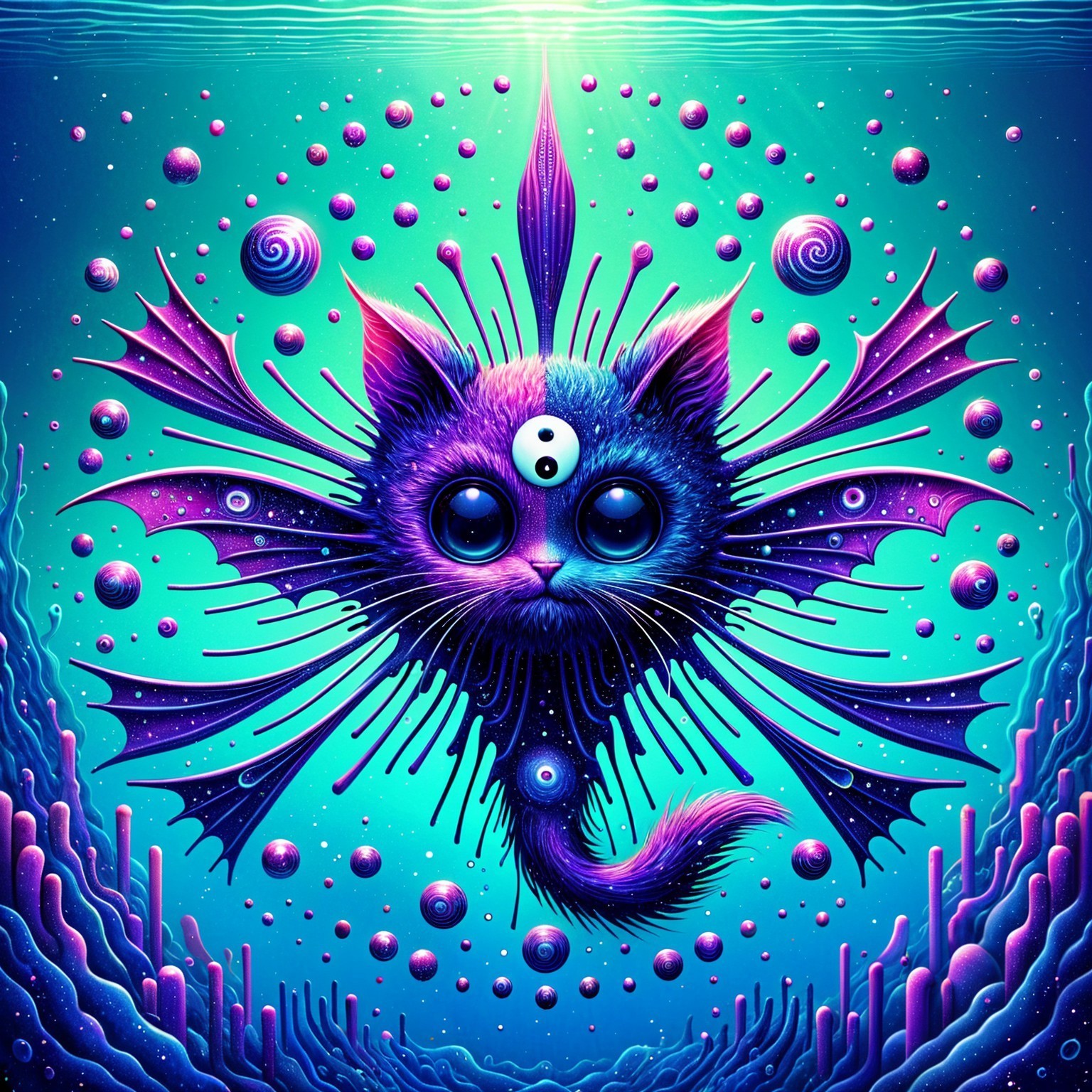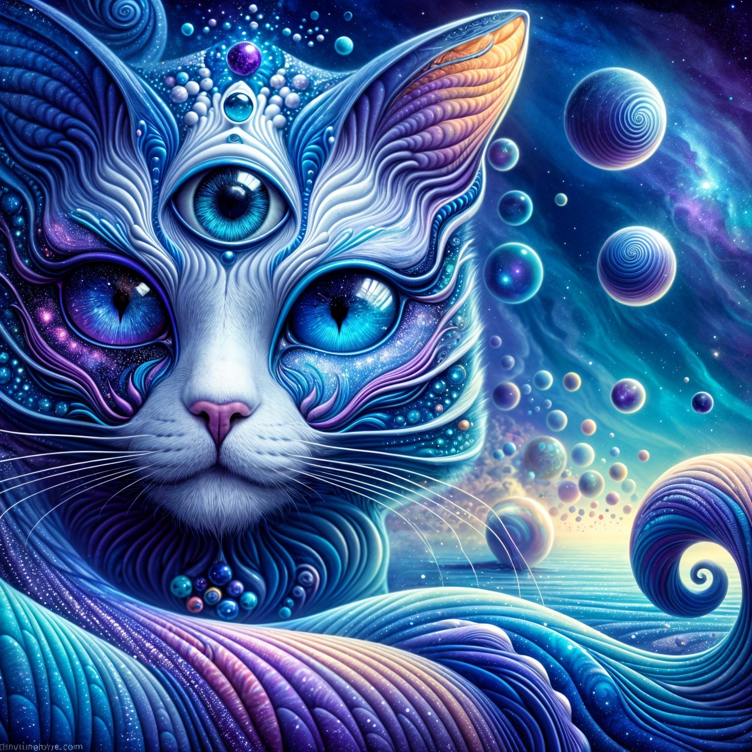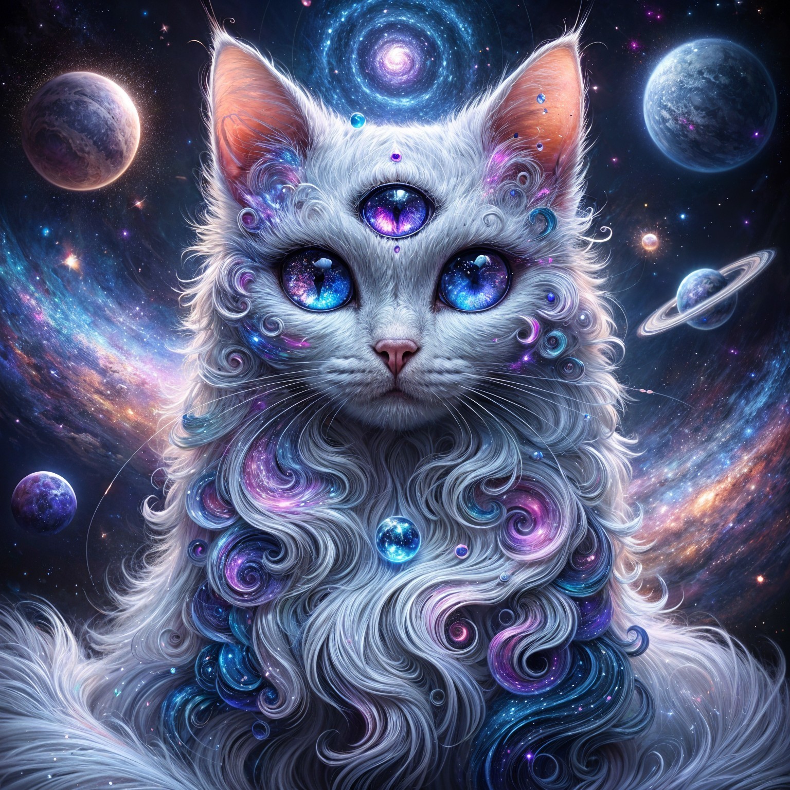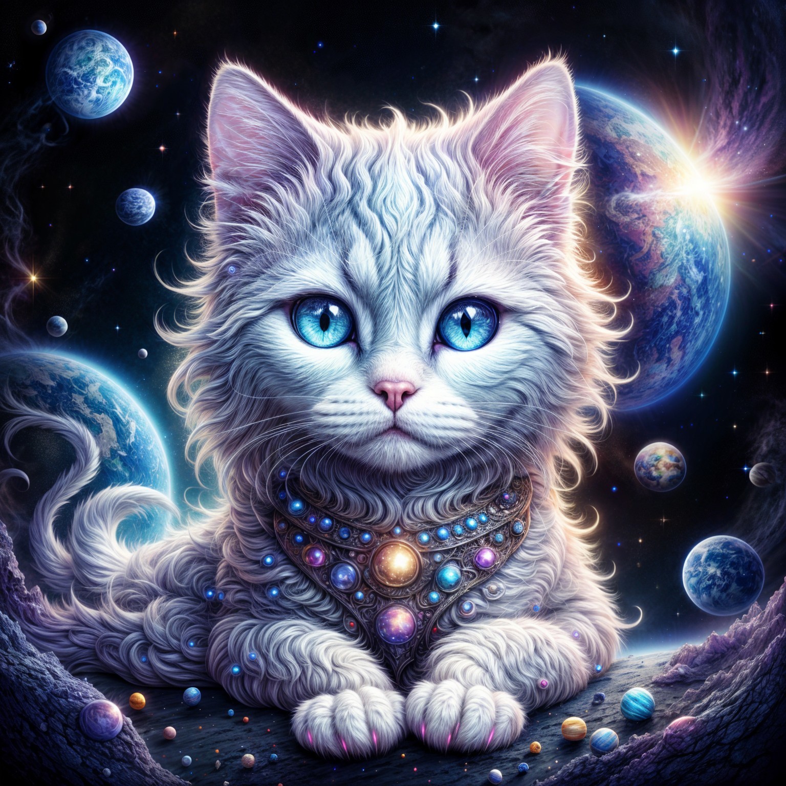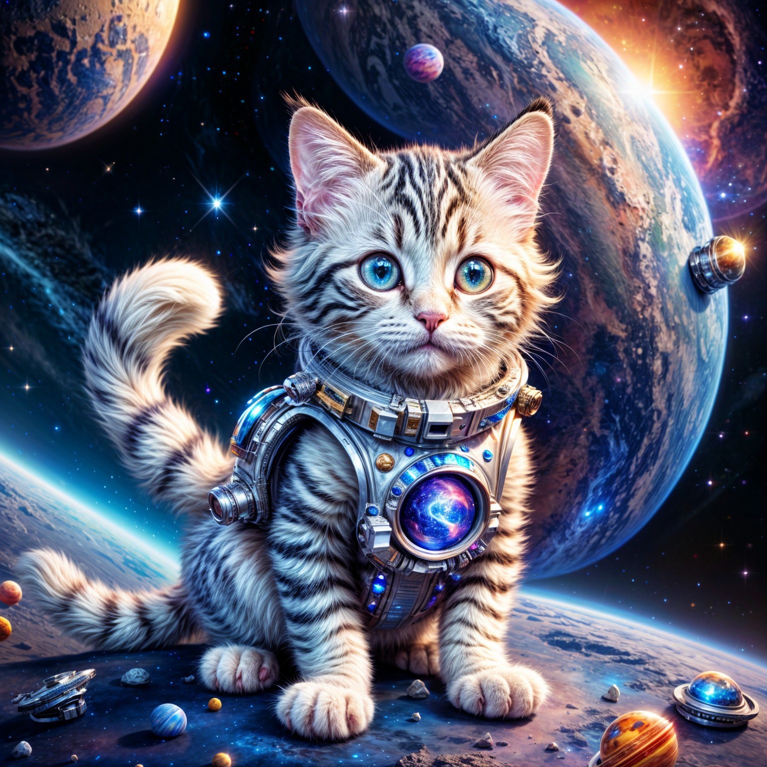 A fluffy cat with striking blue eyes wears a futuristic metallic suit, sitting on a rocky surface against a cosmic backdrop of swirling galaxies and twinkling stars.