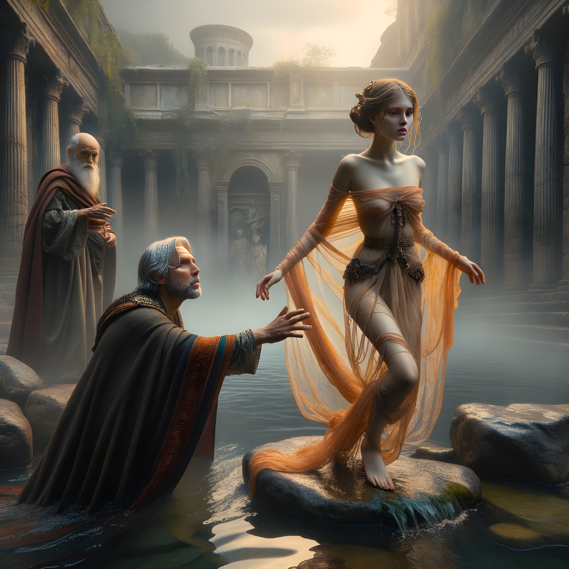 A mystical scene with three figures by water in a grand, ancient temple bathed in soft light.