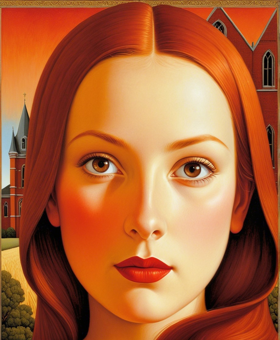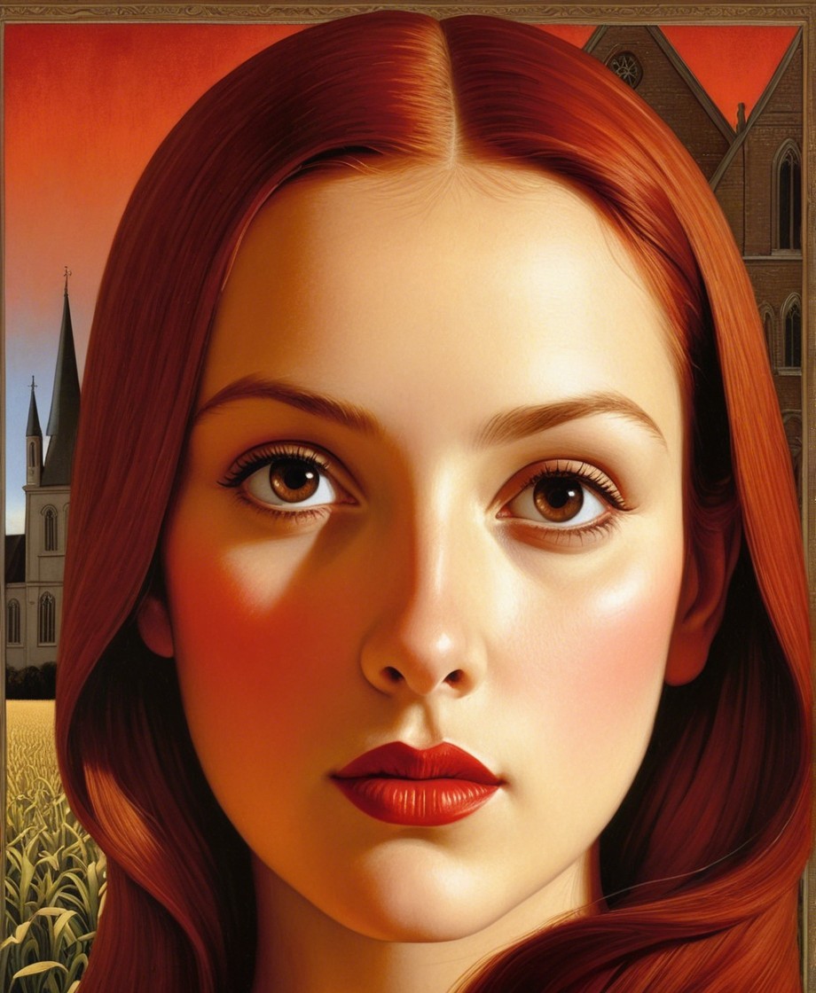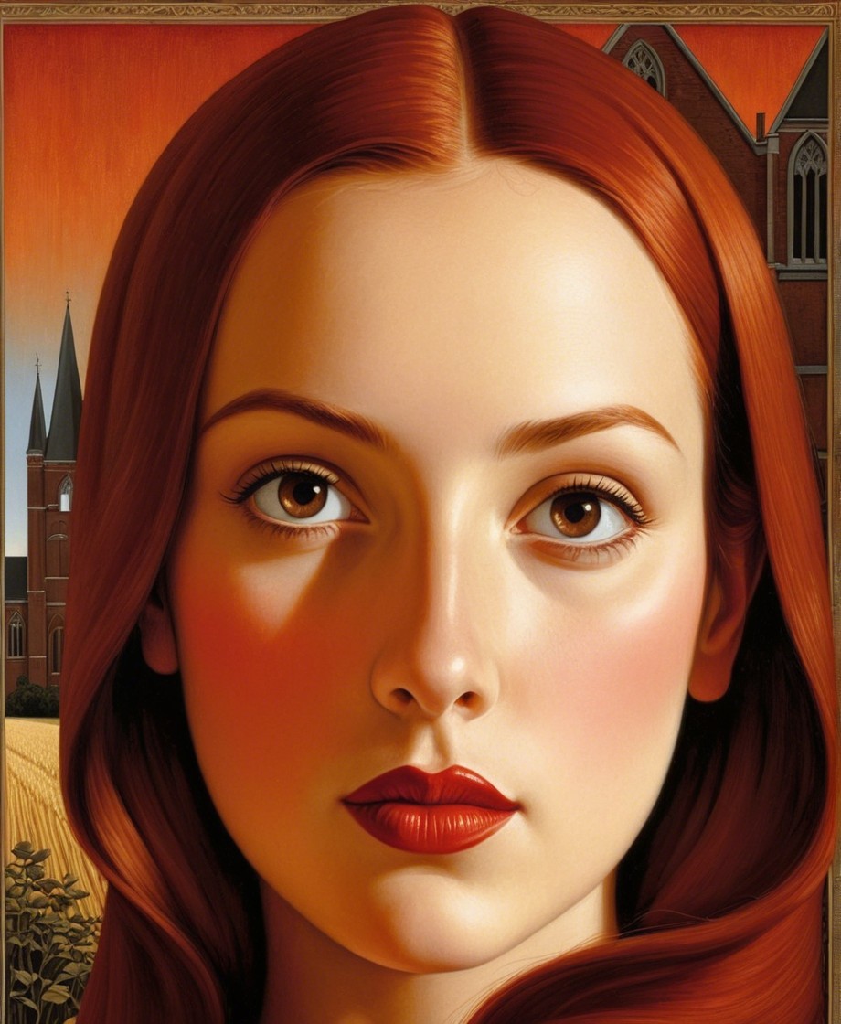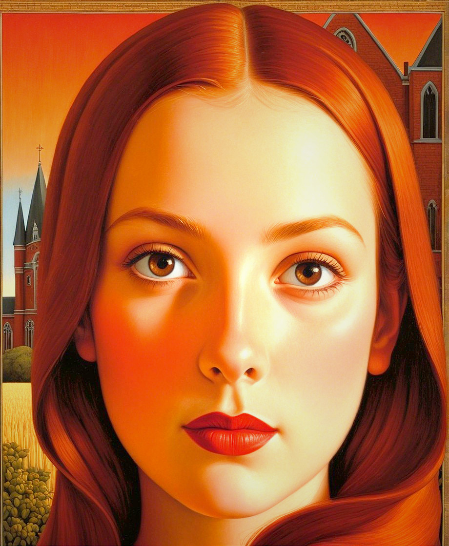 The artwork features a young woman with striking red hair and captivating eyes, set against a warm, orange-hued background that includes a church and a landscape, creating a serene atmosphere.