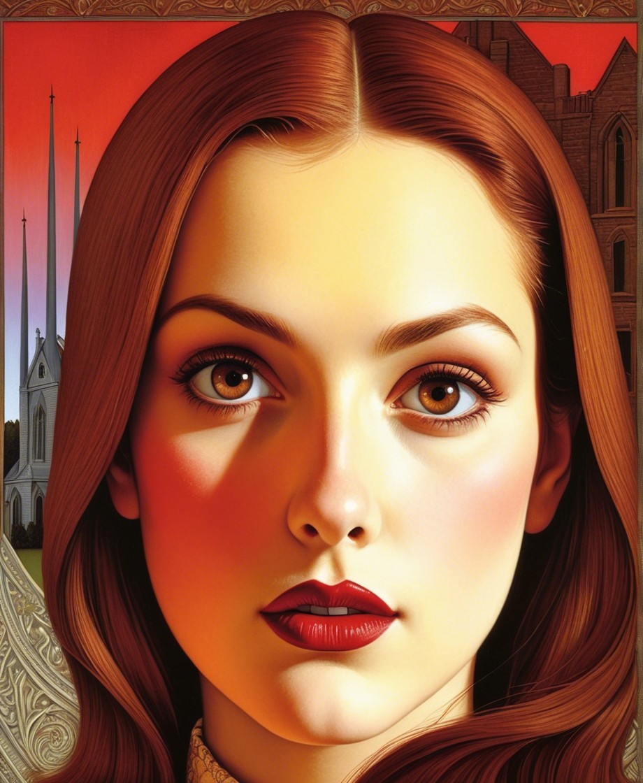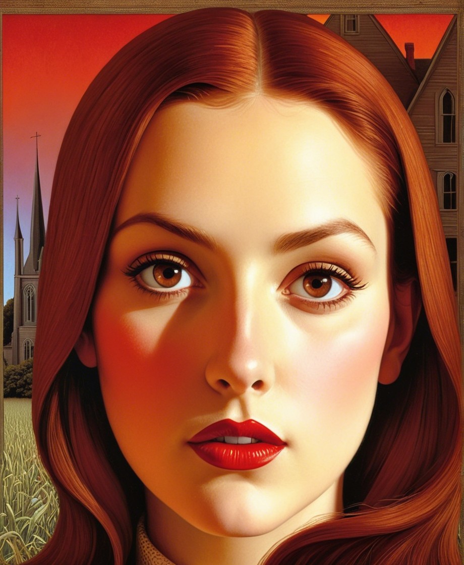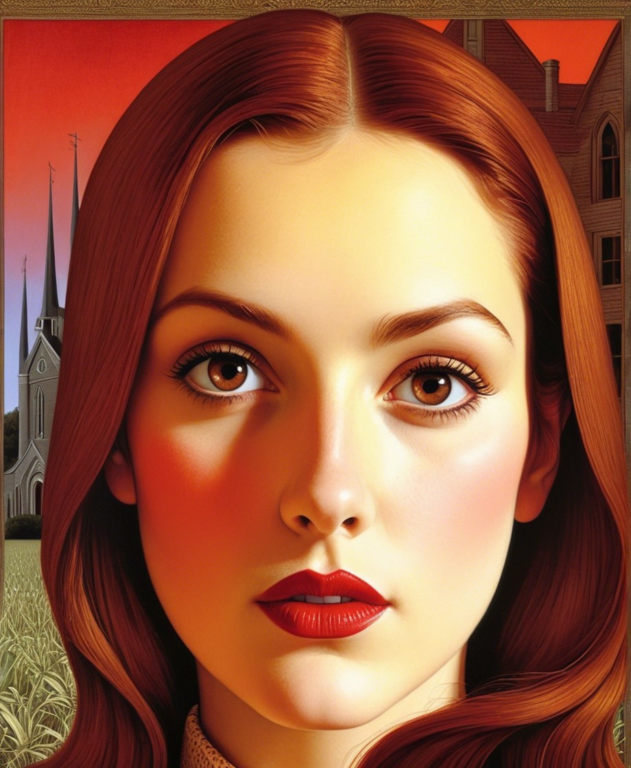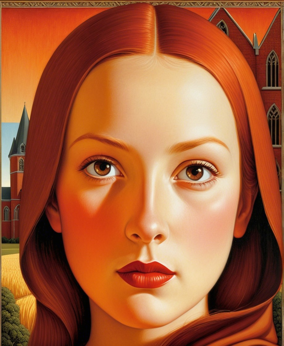 The artwork features a young woman with striking red hair and captivating eyes, set against a warm, orange-hued background that includes a church and a landscape, creating a serene atmosphere.