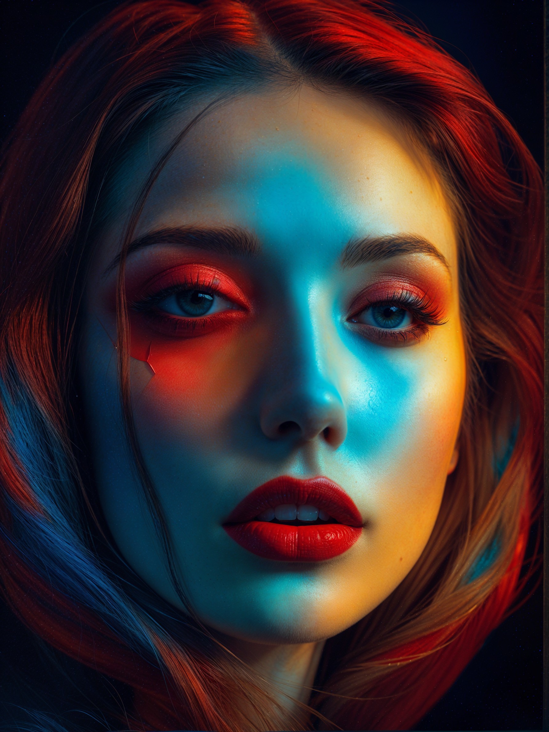 The image features a striking portrait of a woman with elegant curls, bold red lips, and unique face paint—blue and red shapes creating a dramatic and artistic effect against a soft, blurred backdrop.