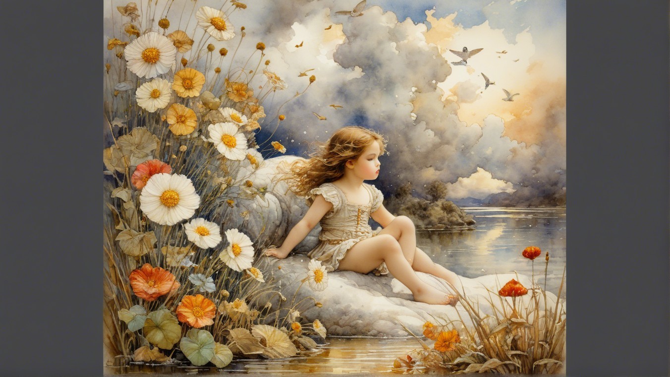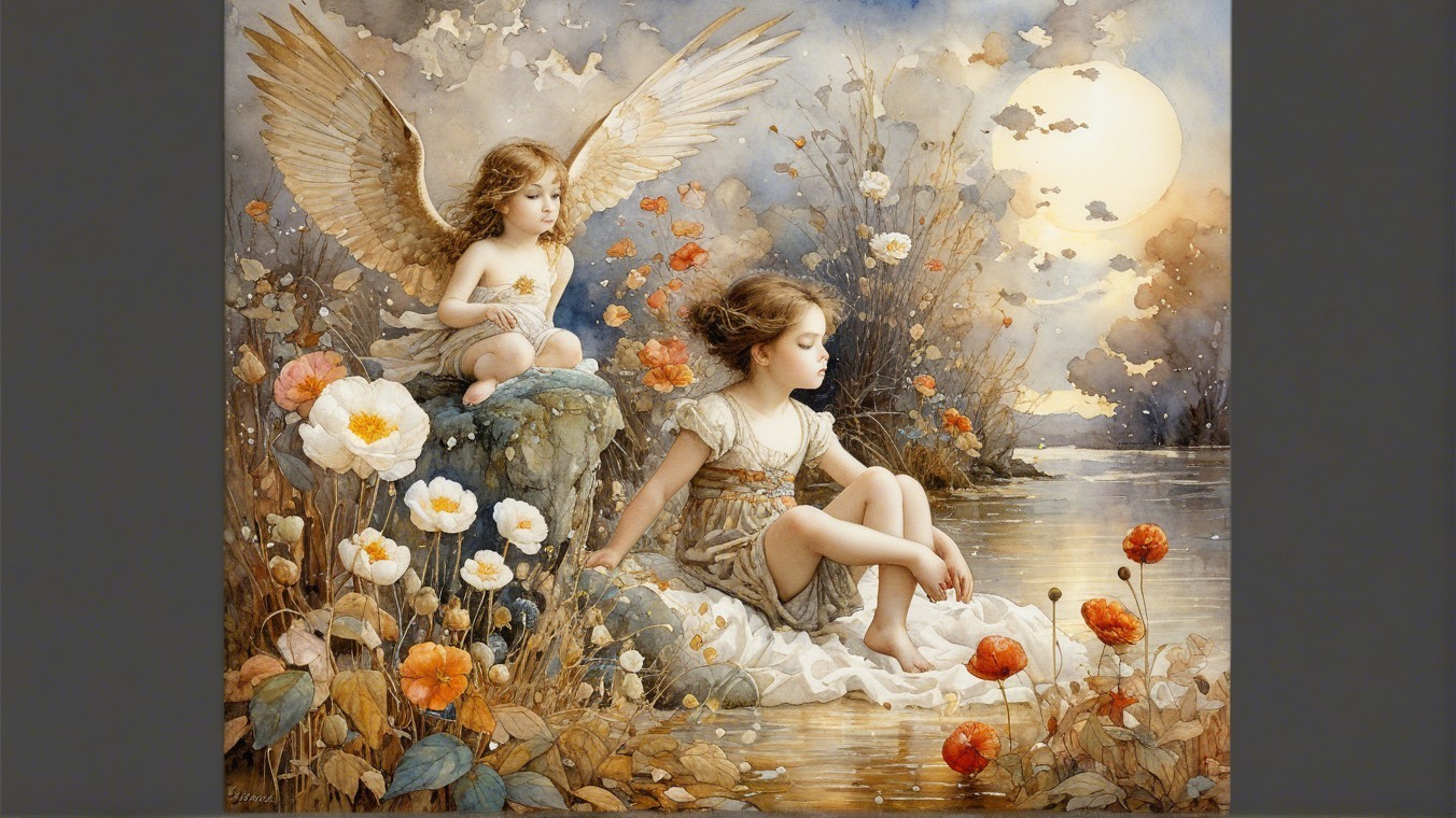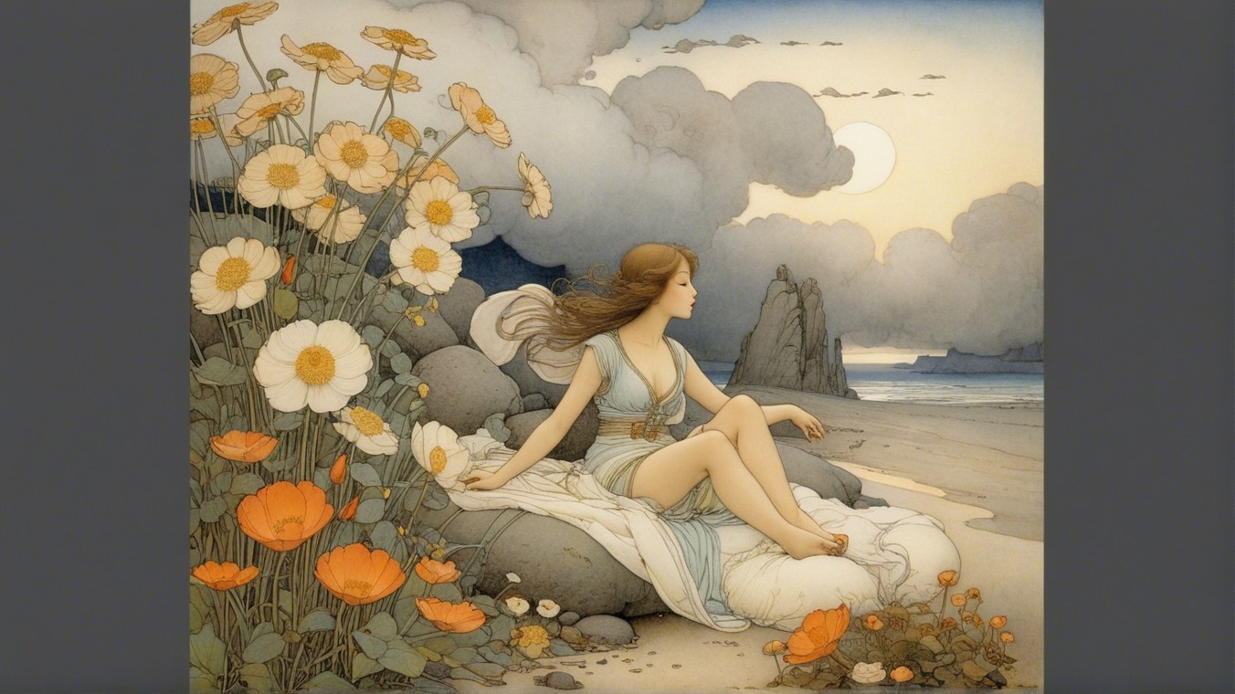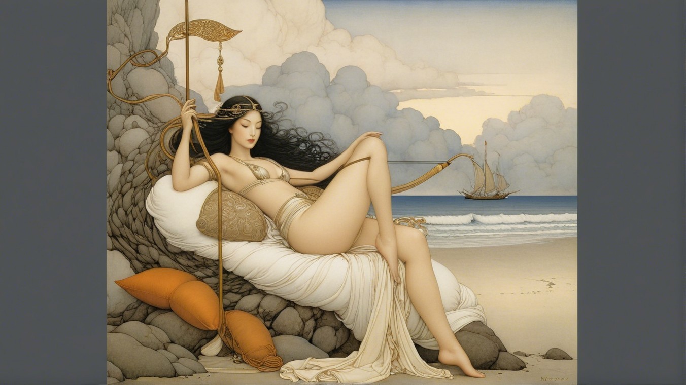 A serene scene features a woman in a shimmering bikini, seated gracefully on a curved object beside a calm ocean. A dog lies near her, with a large, luminous moon illuminating the night sky.