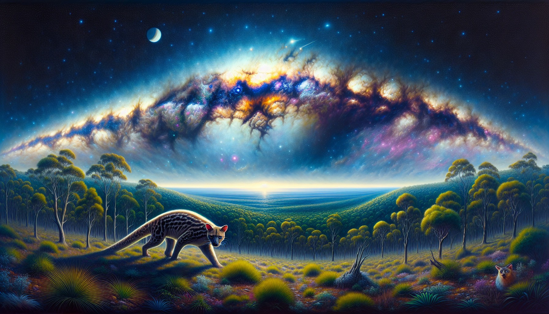 A nocturnal landscape with a spotted animal prowling across lush greenery, under the Milky Way and Moon.