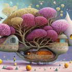 A whimsical treehouse adorned with vibrant purple flowers and lush greenery, featuring a unique architecture with large windows, a welcoming staircase, and a colorful garden surrounding it.