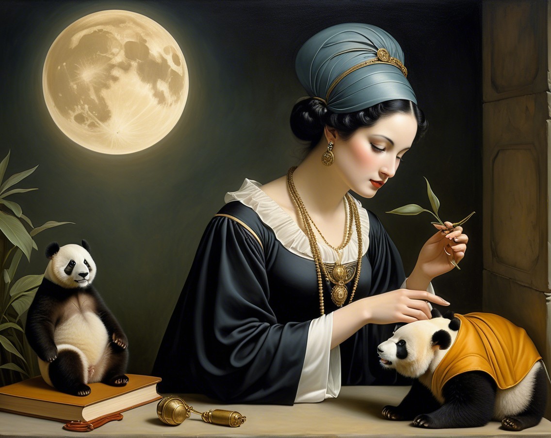 A serene woman in a vintage dress gazes thoughtfully, accompanied by a cute panda. The scene is illuminated by a full moon, with delicate flowers and a teacup enhancing the tranquil atmosphere.
