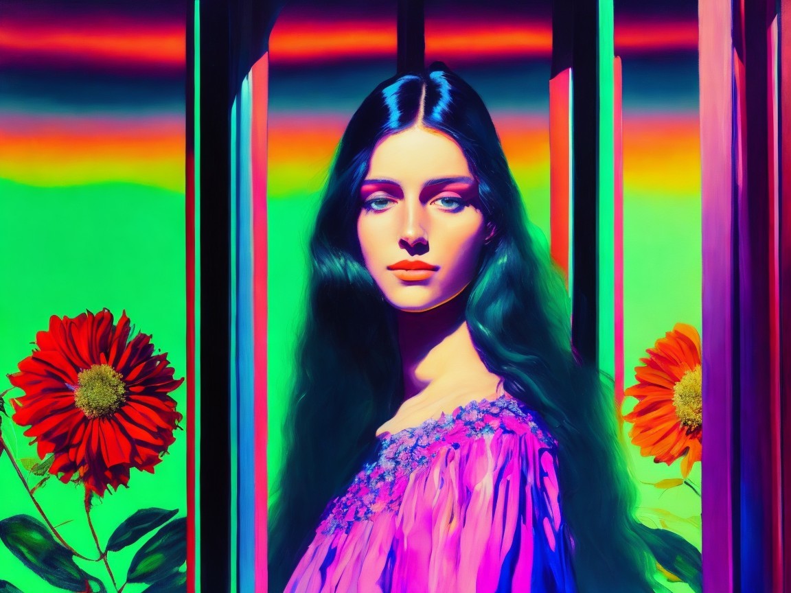 A portrait of a woman with long black hair, wearing a purple blouse, standing between a vibrant green and colorful backdrops adorned with large red flowers.