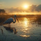 A serene landscape at sunrise features a solitary crane standing in calm waters, surrounded by tall grasses and mist, as golden light reflects on the tranquil surface.