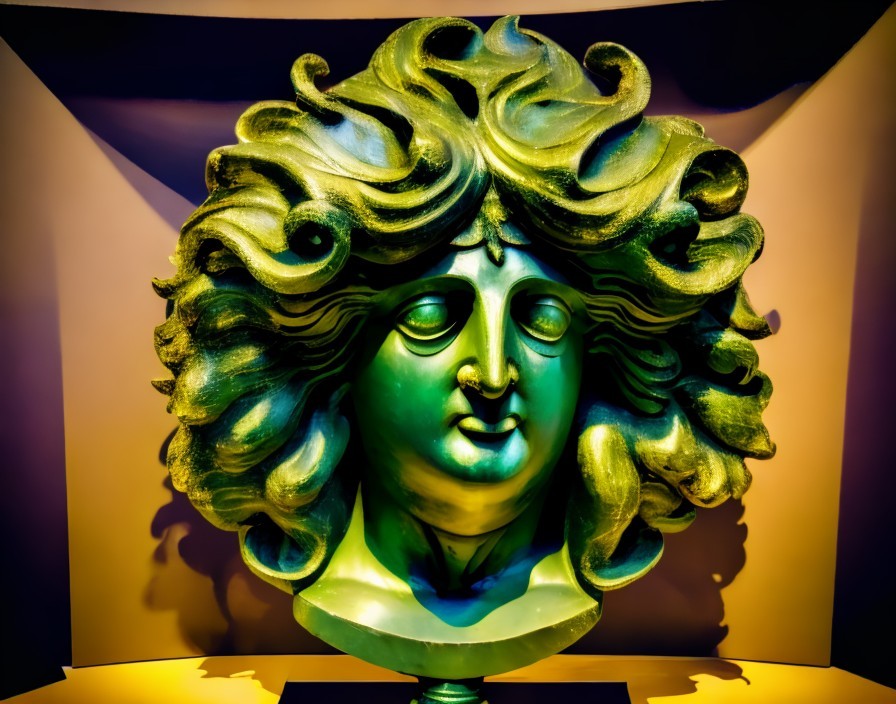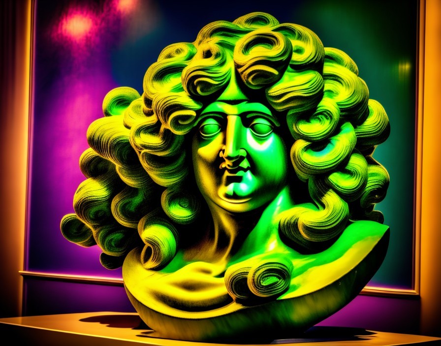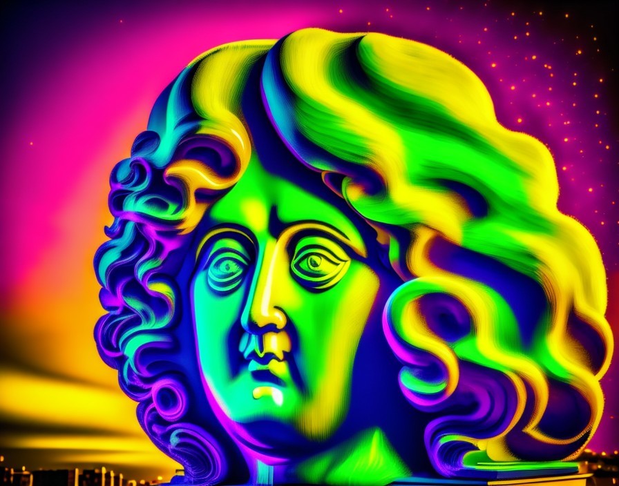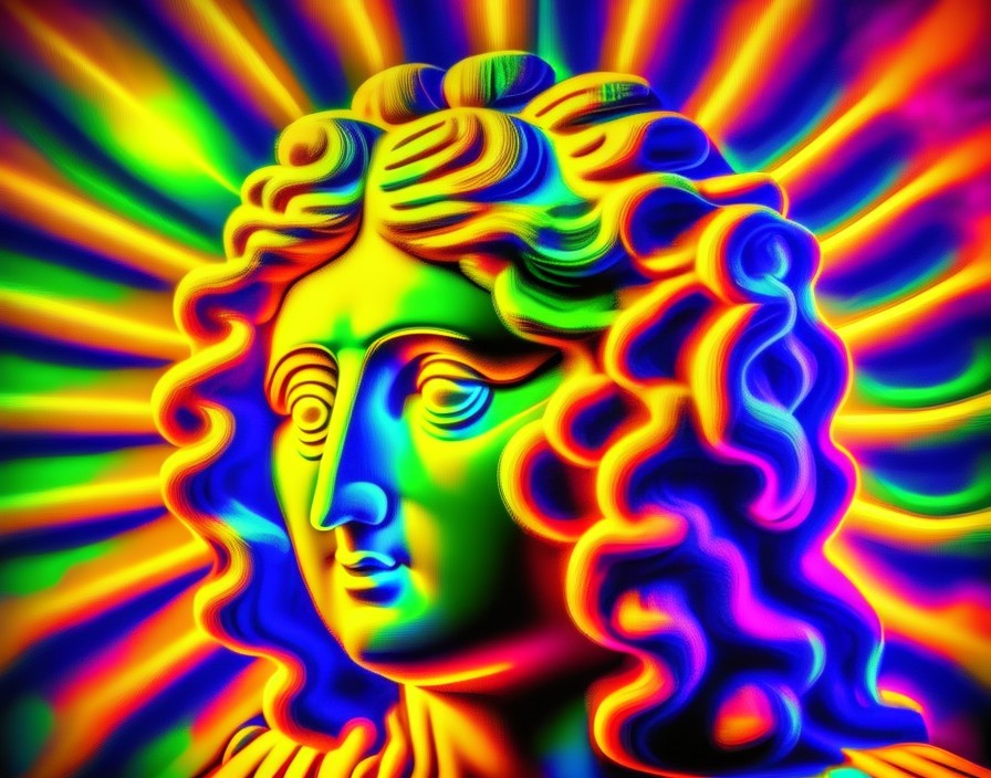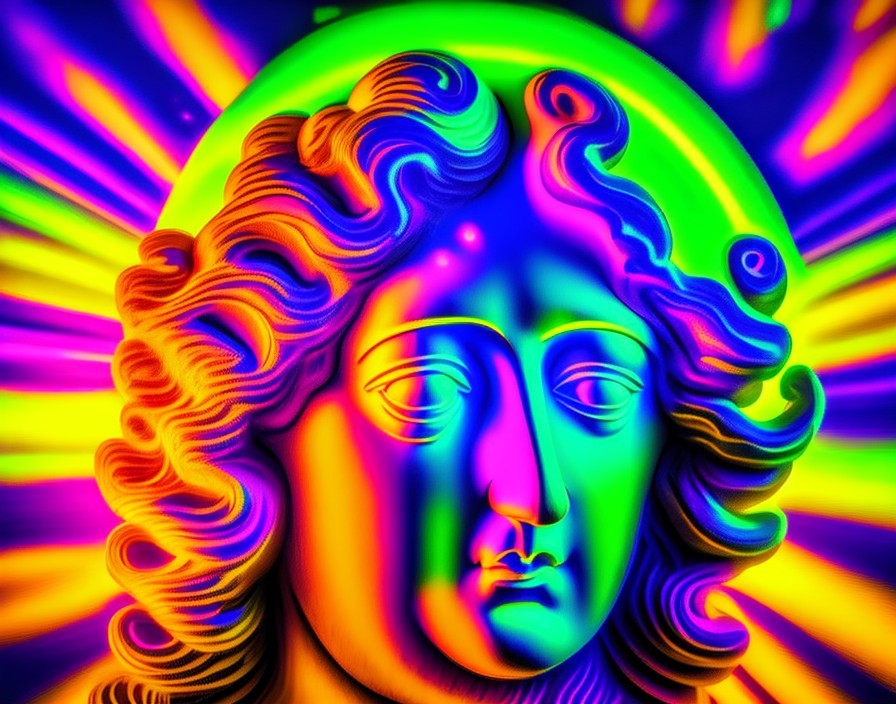 A vividly colored, psychedelic digital art piece with a classical statue head in neon hues against a kaleidoscopic background.