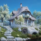 A breathtaking landscape features towering mountains with dramatic peaks and lush valleys. Waterfalls cascade into a serene river, while a distant planet adorns the vibrant blue sky.