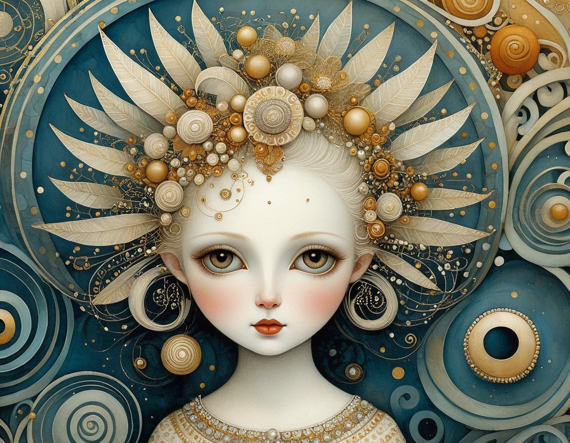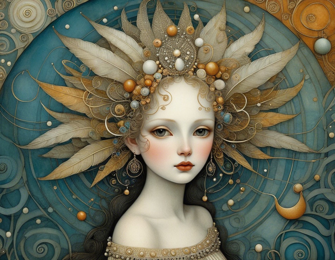The image features a serene figure with intricate, ornamental detailing in her hair, decorated with stylized leaves and pearls. A vibrant, swirling background enhances her ethereal presence.