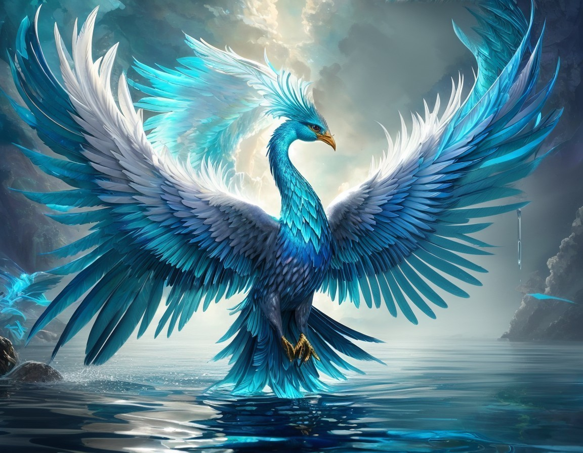 A majestic, blue-feathered phoenix with outstretched wings stands in water, amidst a dramatic rocky landscape.