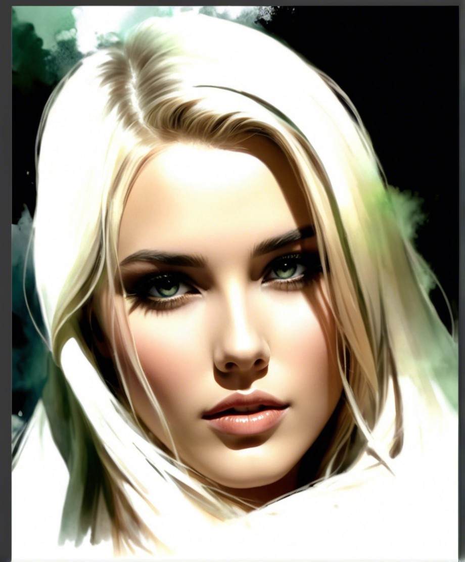 The image features a close-up of a woman with long, flowing blonde hair and striking green eyes, adorned with a light scarf that gently frames her face against a dark, atmospheric background.