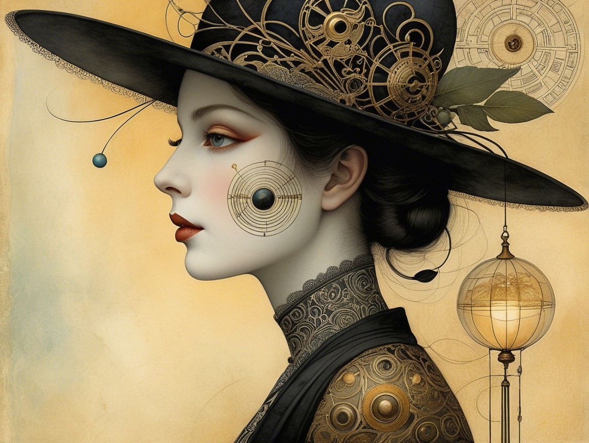 A graceful profile of a woman in a wide-brimmed hat adorned with feathers and a small bird. She wears elegant jewelry, and her makeup features striking red accents against a soft background.