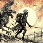 Lone Warrior and Griffon in Fiery War-Torn Landscape