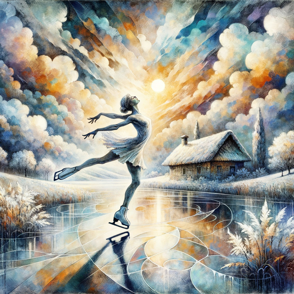 A graceful ice skater in a blue dress glides on a frozen lake under a large, glowing moon. Bare trees surround the serene scene, reflecting a magical winter sunset.