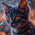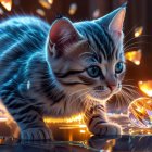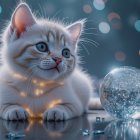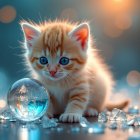 A curious orange tabby kitten gazes at a magic glass ball, which contains a miniature version of itself. Sunlight sparkles on the surface, creating a whimsical and enchanting atmosphere.