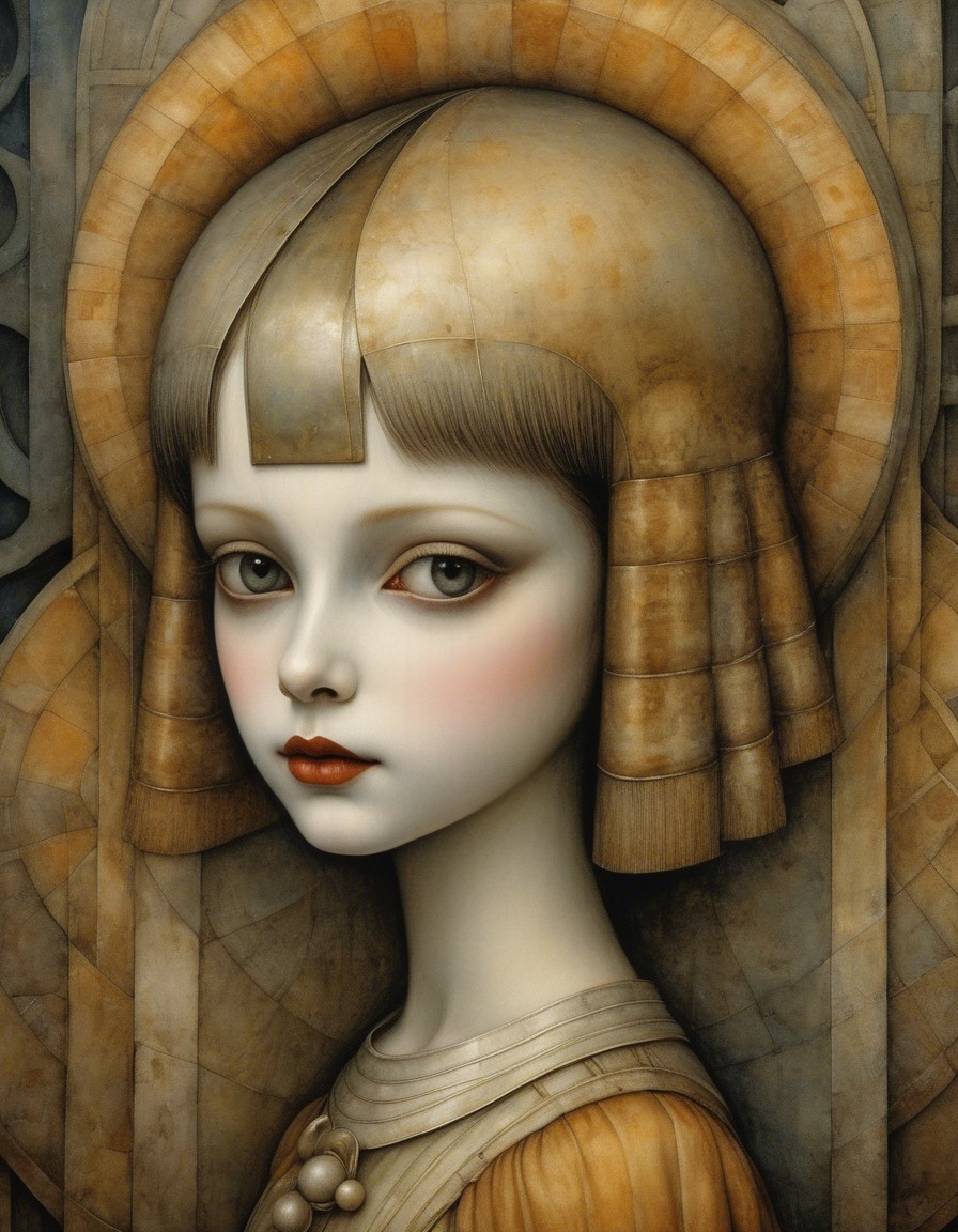 A striking portrait of a young woman with an intricate metallic headdress. She has pale skin, deep-set eyes, and a serene expression, set against an ornate, geometric background.