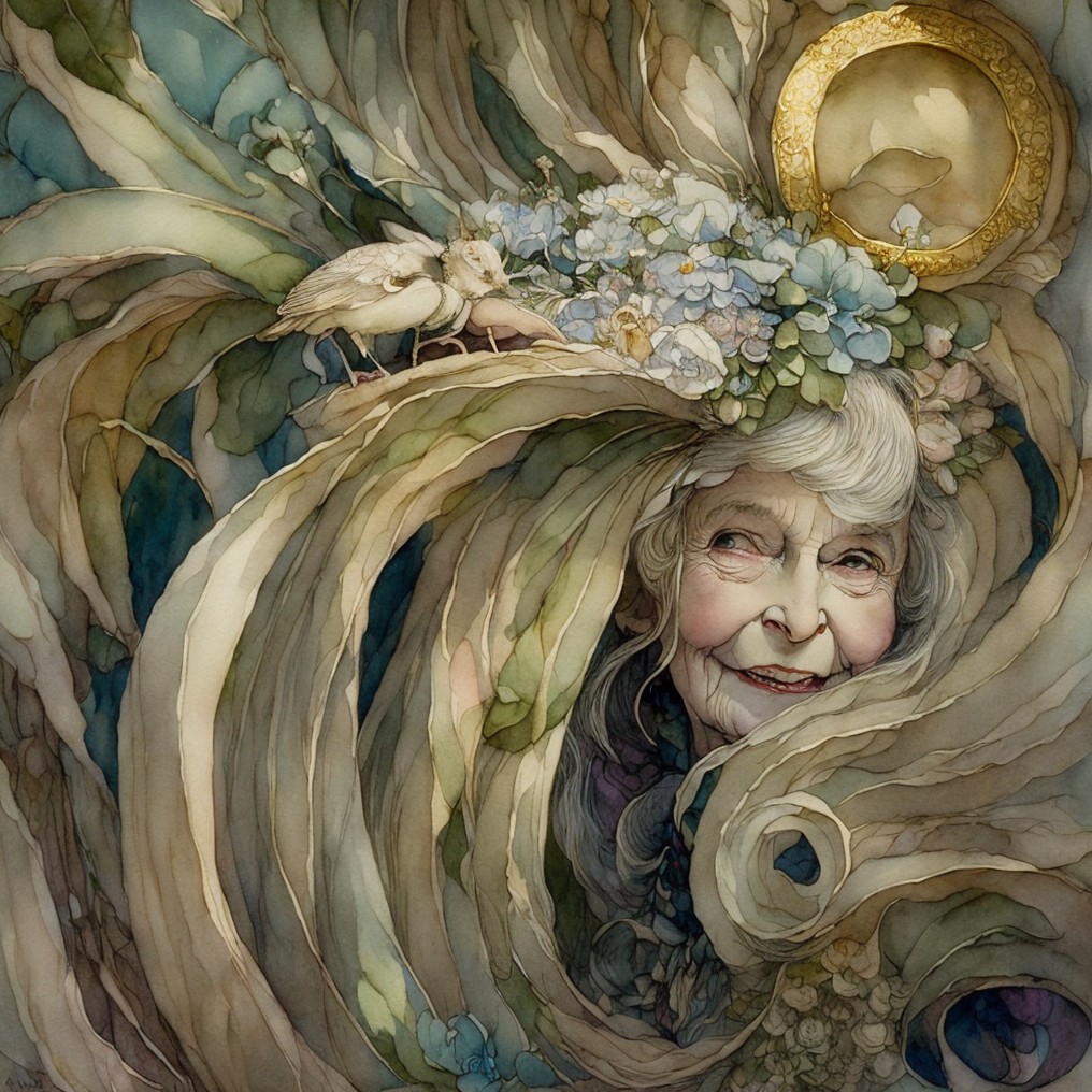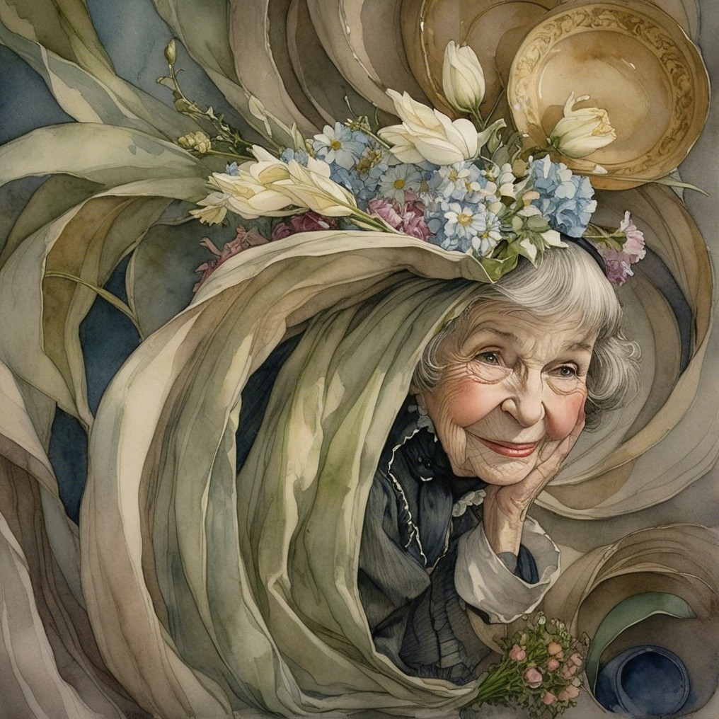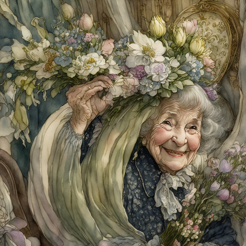 An elderly woman joyfully arranges vibrant flowers in a cozy kitchen. Surrounded by vintage pottery, her warm smile and colorful blooms create a charming and inviting atmosphere.
