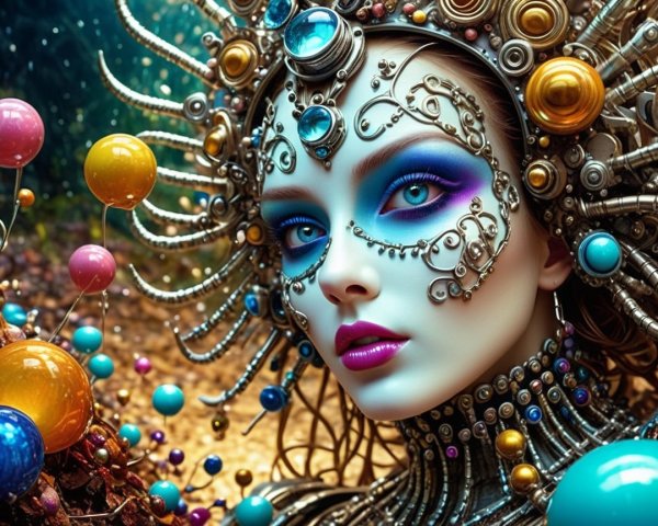 A captivating fantasy figure with striking red wings and dark attire, adorned with intricate details. Her bold makeup and elegant accessories create a powerful and enchanting presence.
