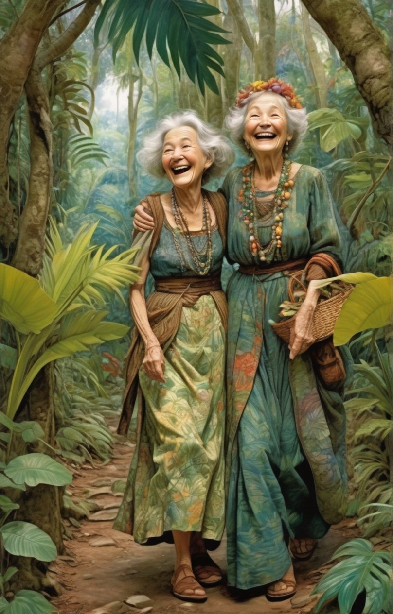 Two joyful elderly women in colorful clothes, sharing a hearty laugh, walking in a lush forest with wicker baskets.