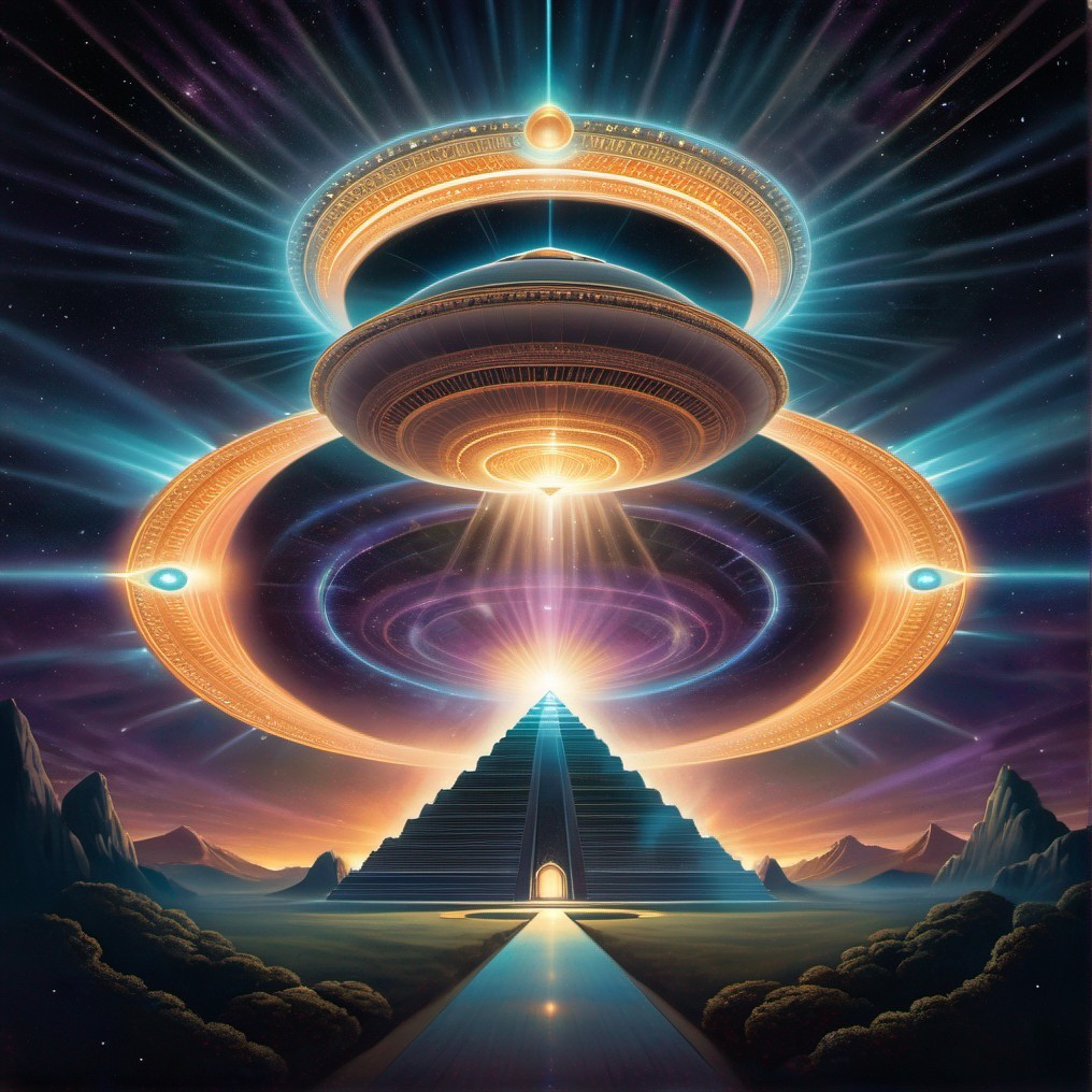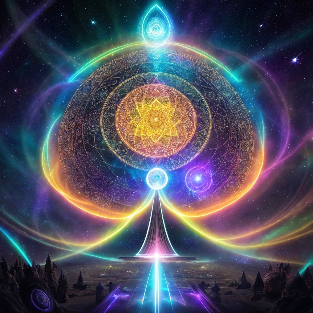 A luminescent human silhouette stands at the center of mystical architecture under a cosmic, glowing mandala with orbiting rings of light.