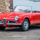 A vibrant red vintage 1961 Alfa Romeo Giulietta Spider i convertible, showcasing classic Italian design with sleek curves and chrome accents, parked on a charming street lined with historic stone buildings and greenery.