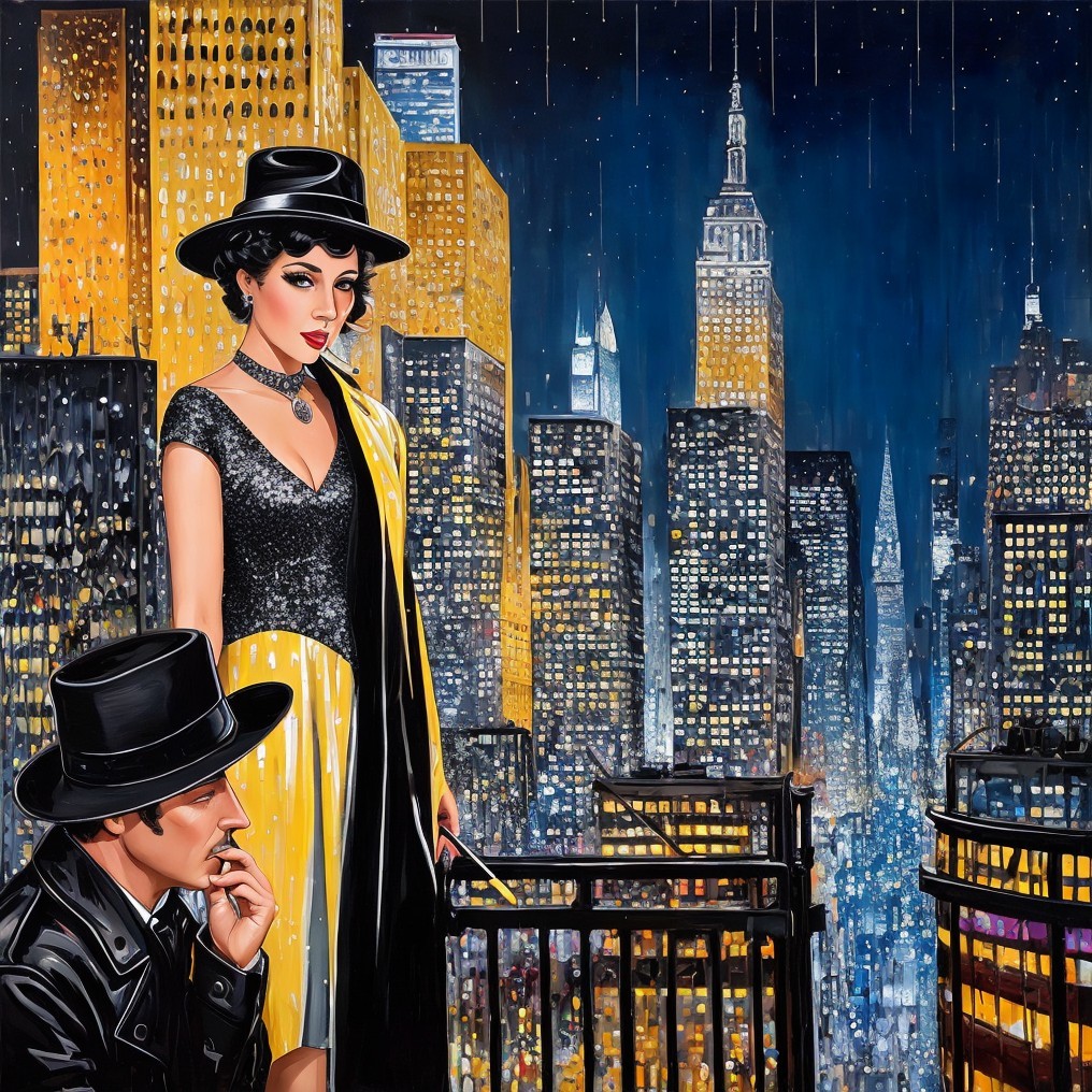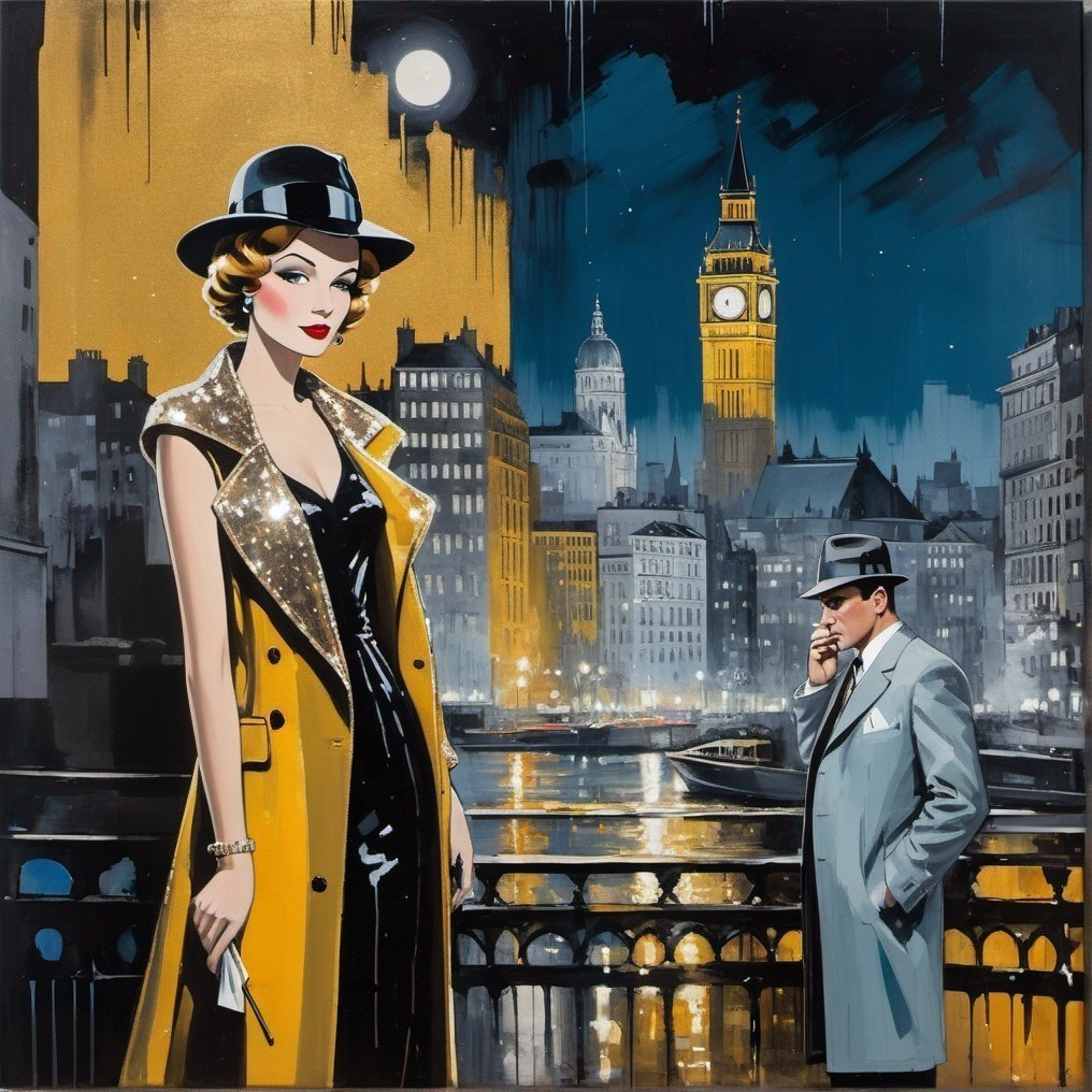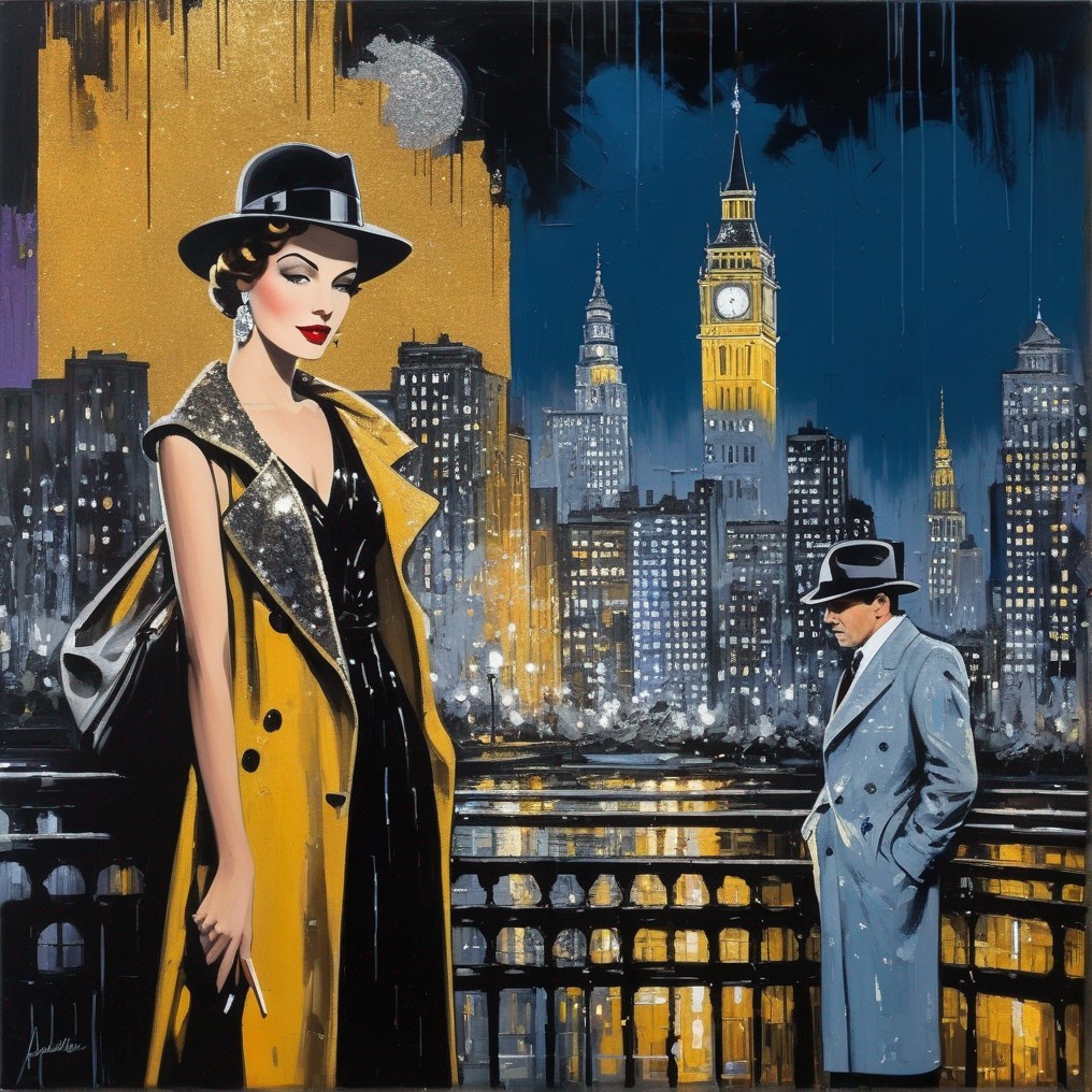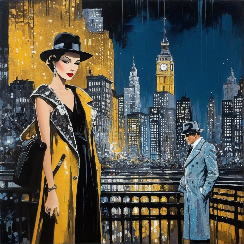 Prompt: The art of melting splashes. A detective from the 30s stands in a coat and hat, with a cigarette in his hand, and next to him is a charming lady in a sequined dress with a bare back. Night city in the background. Style of Louis Jover and Michel Cheval.