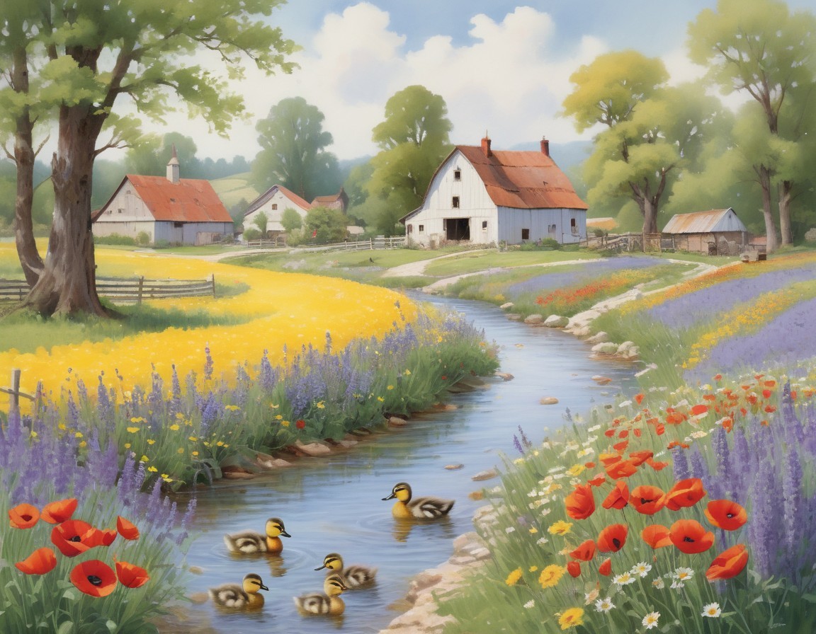 A scenic countryside painting with ducks in a stream, vibrant wildflowers, and farmhouses amidst lush trees.