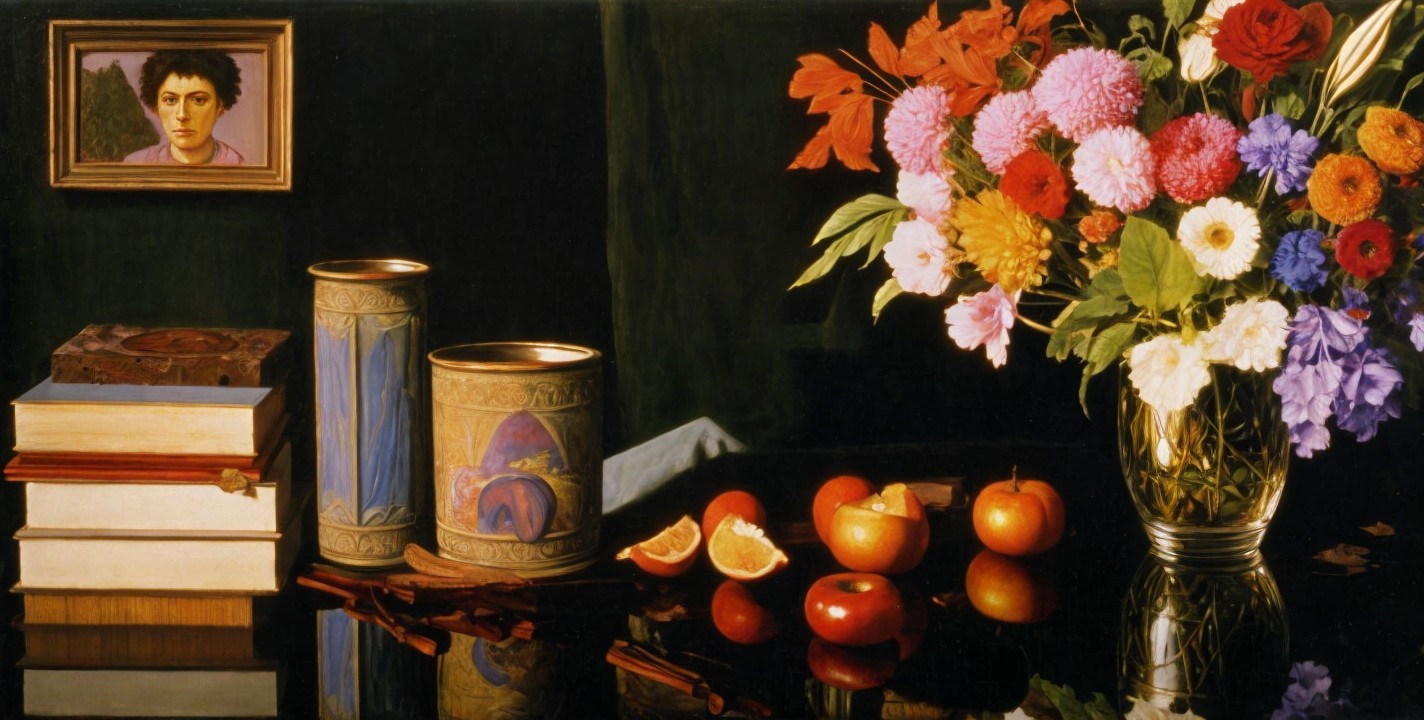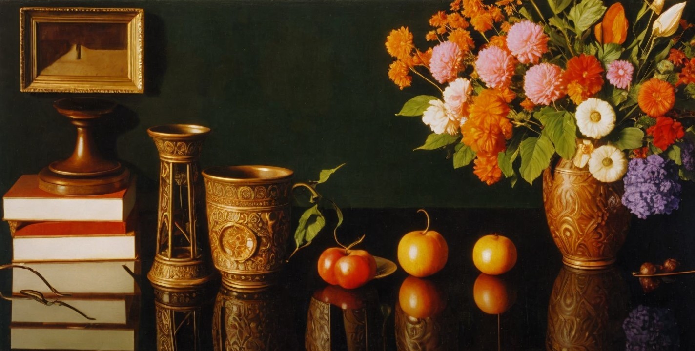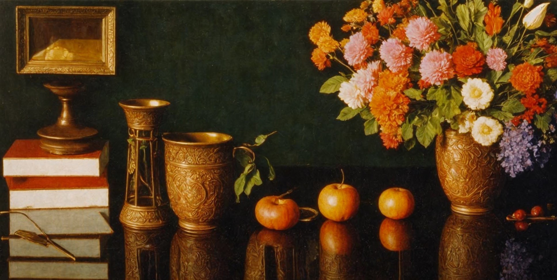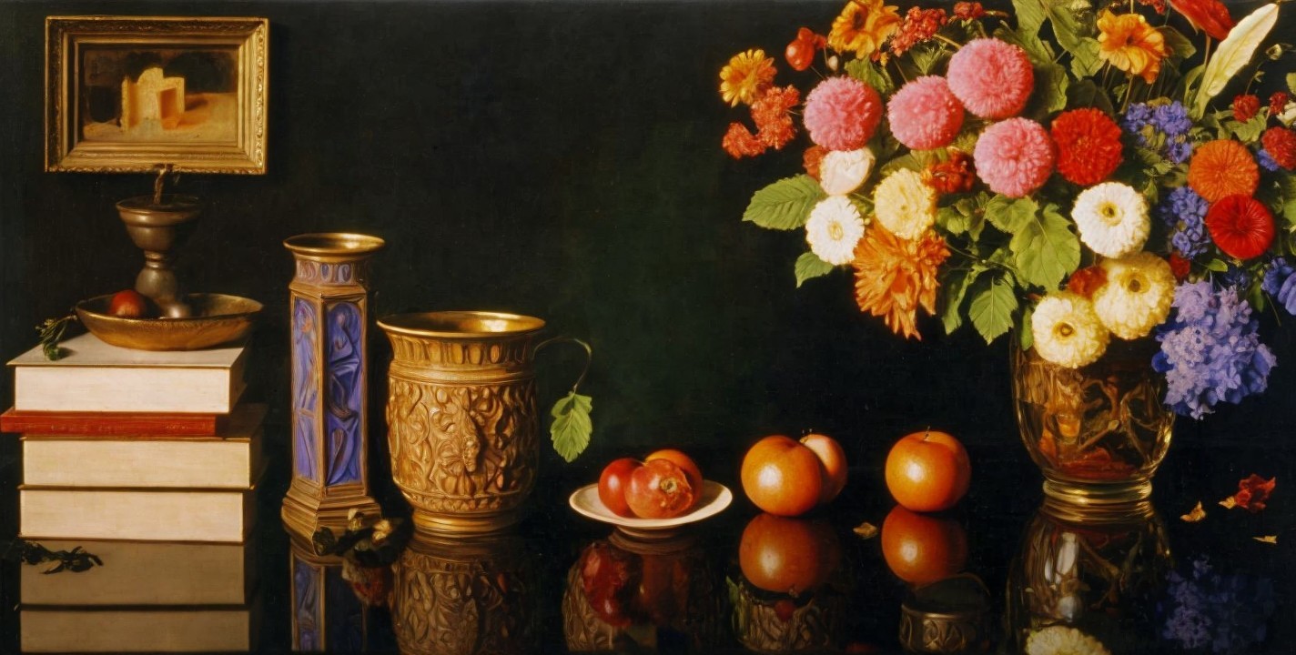 A still life painting depicting vibrant flowers in a vase, stacked books, brass vessels, and apples on a reflective surface.