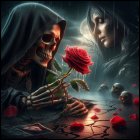 A mystical scene featuring two alluring women, one with long hair and gothic attire, the other in a dark crown. They are joined by a skeletal figure, surrounded by candlelight and ethereal smoke.