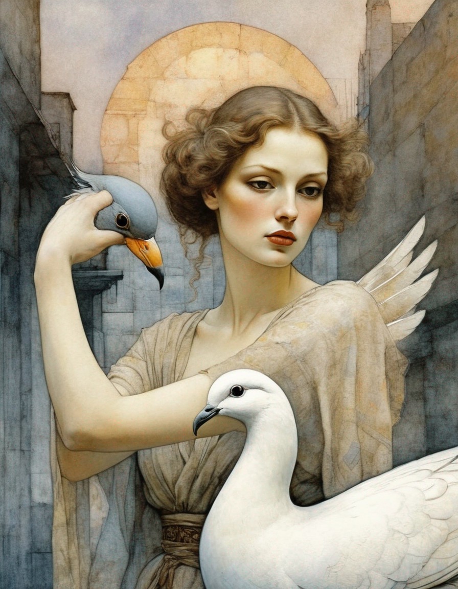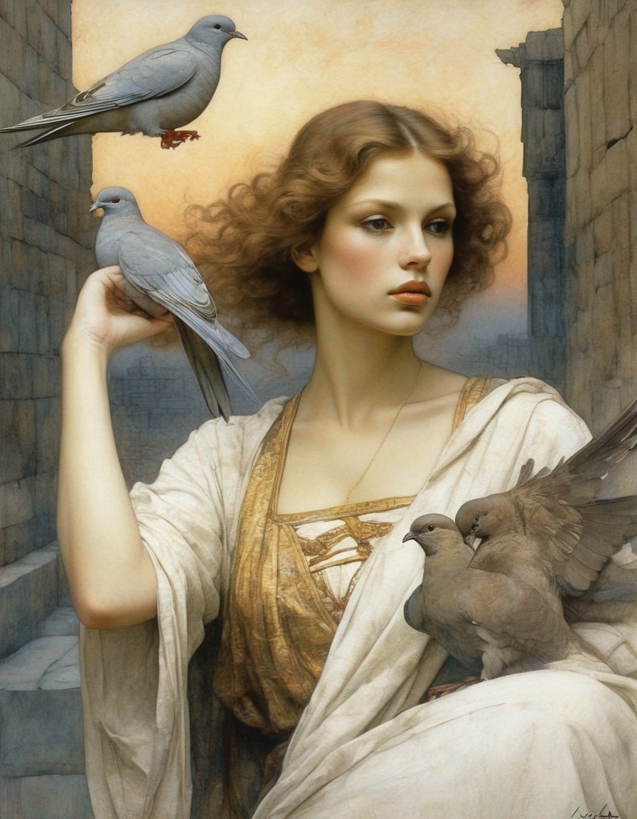 A woman in a vintage dress stands in an ancient alleyway with white doves flying around her.