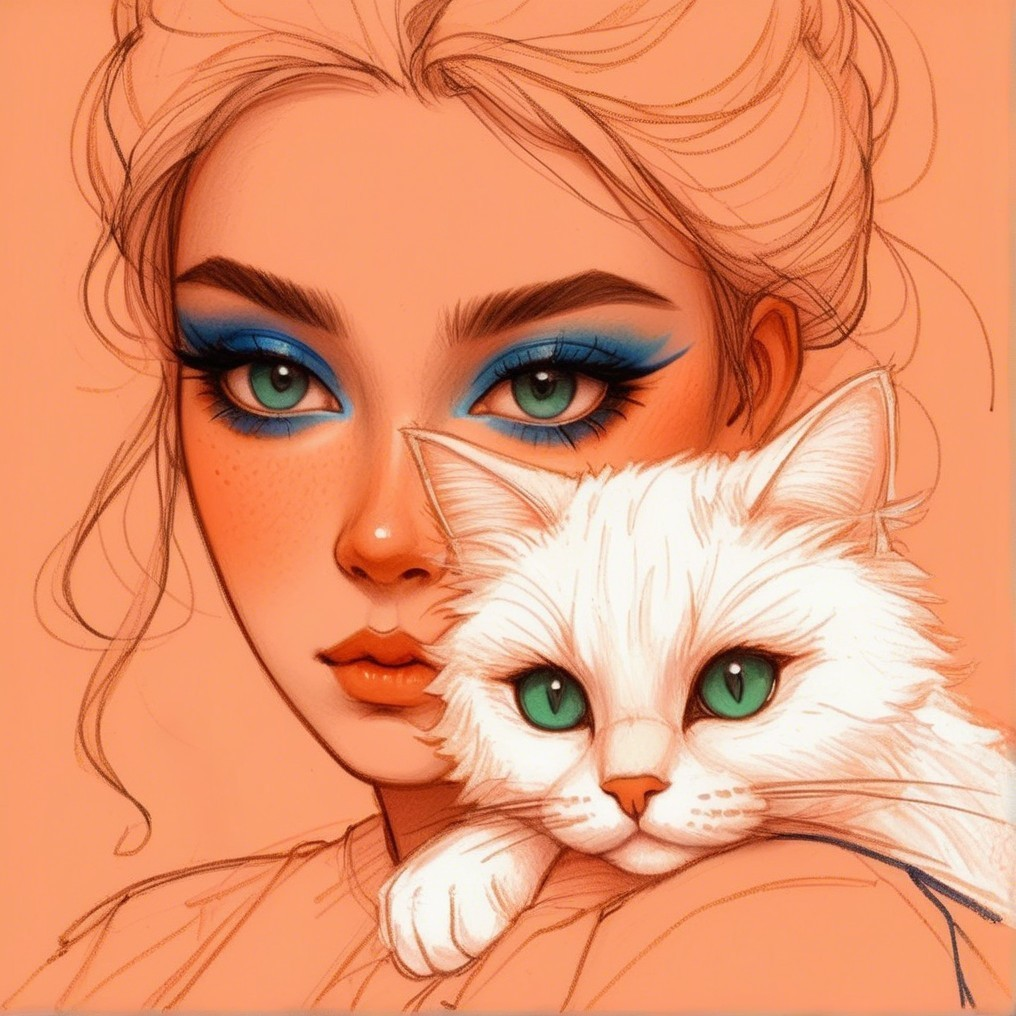 A girl with striking blue eye makeup and green eyes holds a fluffy white cat close. Her warm expression contrasts with the soft, peachy background, creating a charming, cozy vibe.