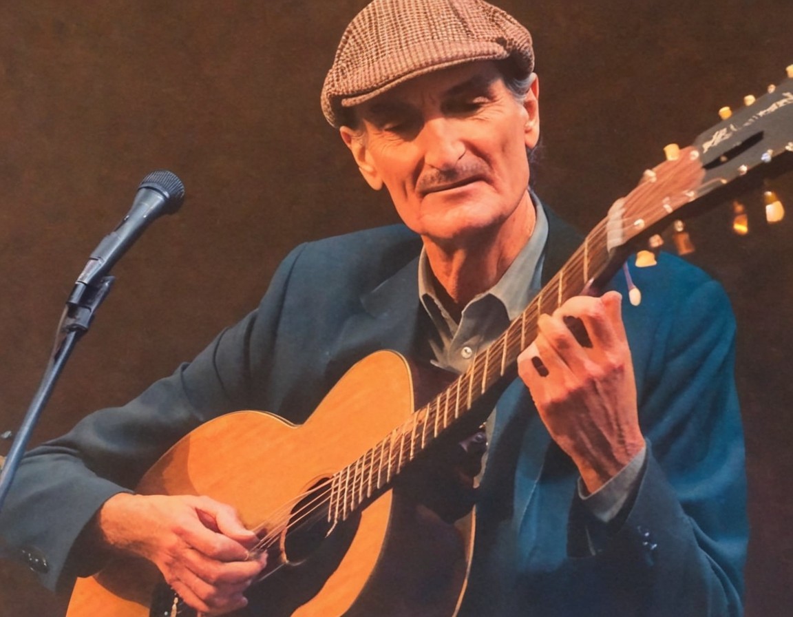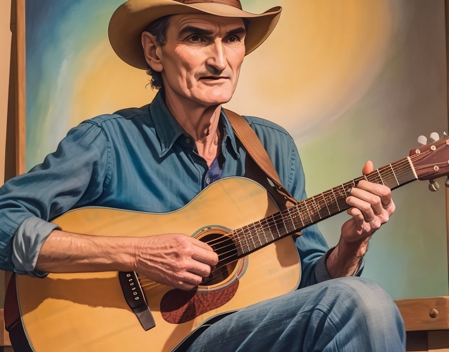 An illustrated cowboy playing an acoustic guitar, wearing a hat, with a colorful background. Hoping to be a painting of James Taylor...
