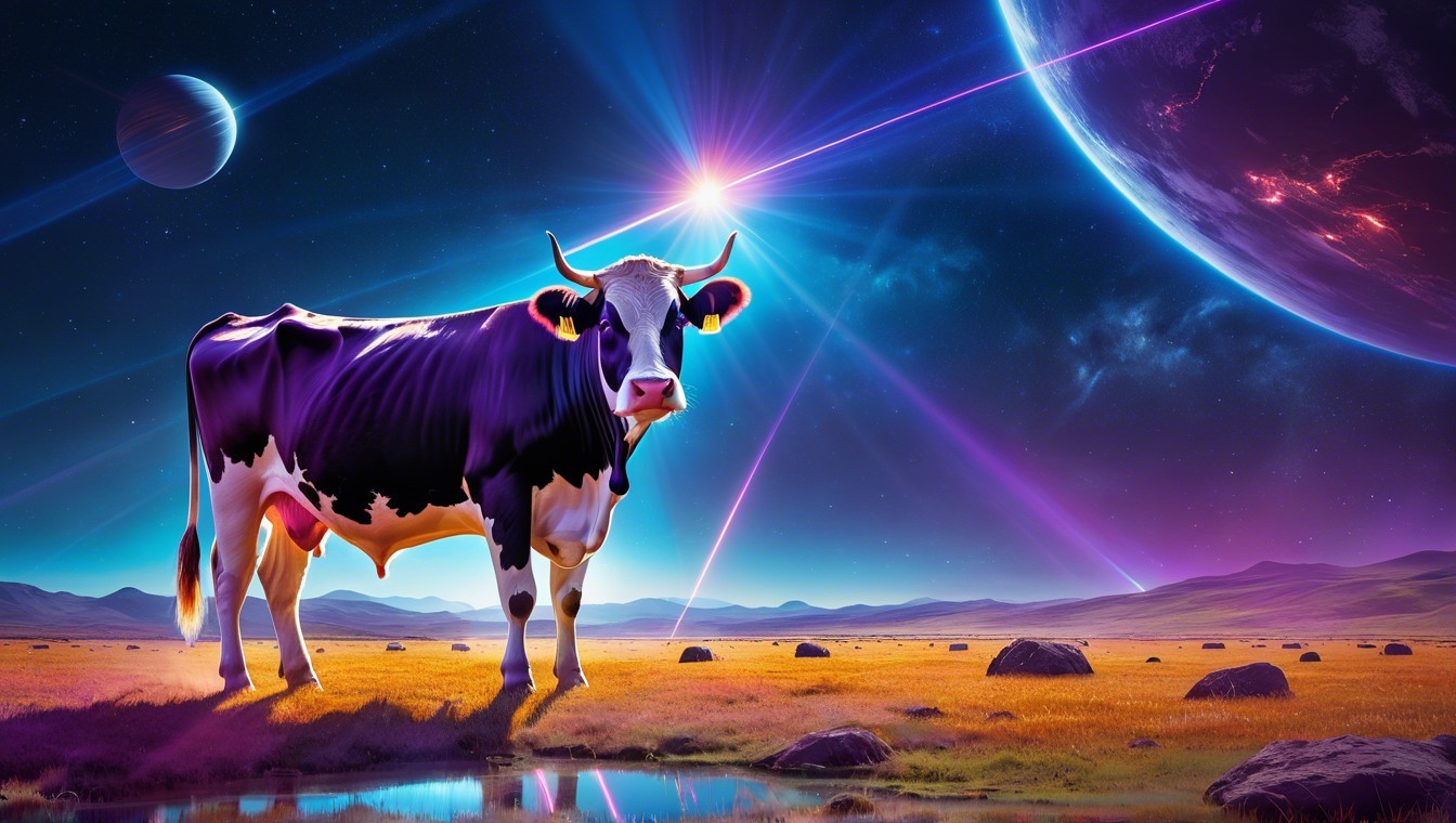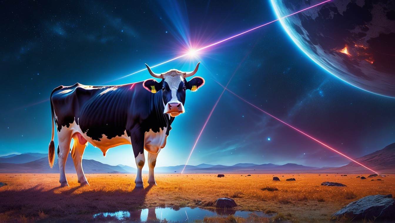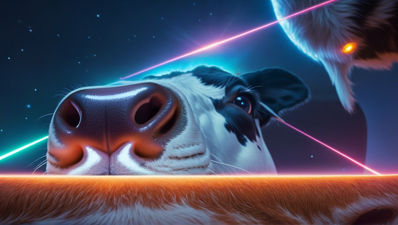 A close-up of a cow wearing headphones, gazing intently. Colorful laser beams intersect in the background, creating a vibrant, surreal atmosphere that combines farm life with a futuristic vibe.