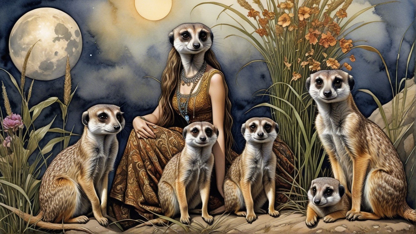A surreal scene features a woman with a meerkat's head sitting among a group of meerkats. The background includes tall grass and a glowing moon, creating a whimsical, fantastical atmosphere.